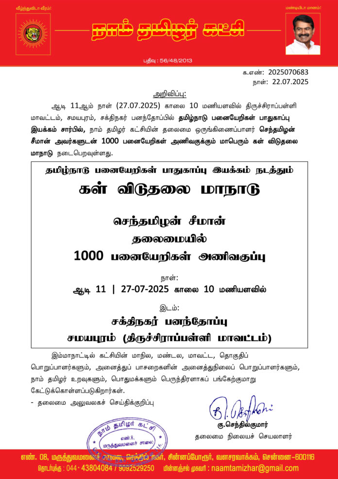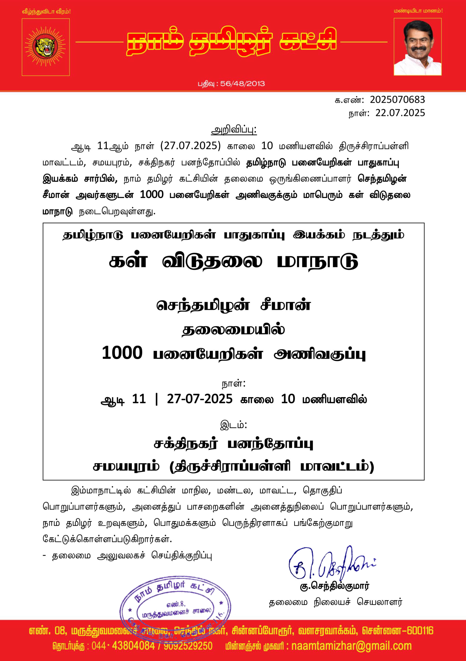 ஆடி 11ஆம் நாள் (27.07.2025) காலை 10 மணியளவில் திருச்சிராப்பள்ளி மாவட்டம், சமயபுரம், சக்திநகர் பனந்தோப்பில் தமிழ்நாடு பனையேறிகள் பாதுகாப்பு இயக்கம் சார்பில், நாம் தமிழர் கட்சியின் தலைமை ஒருங்கிணைப்பாளர் செந்தமிழன் சீமான் அவர்களுடன் 1000 பனையேறிகள் அணிவகுக்கும் மாபெரும் கள் விடுதலை மாநாடு நடைபெறவுள்ளது.