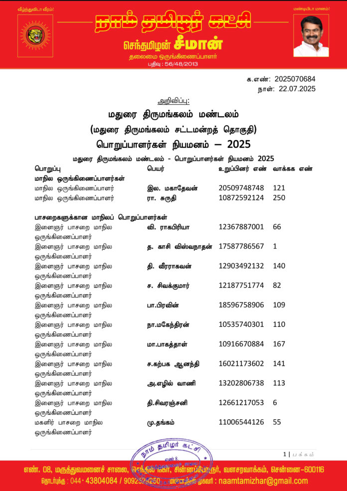 மேற்காண் அனைவரும் நாம் தமிழர் கட்சி – மதுரை திருமங்கலம் மண்டலத்திற்குட்பட்ட பொறுப்பாளர்களாக நியமிக்கப்படுகிறார்கள். இவர்கள் அனைவருக்கும், கட்சியின் அனைத்துநிலைப் பொறுப்பாளர்களும், அன்பு உறவுகள் அனைவரும் முழு ஒத்துழைப்பு நல்குமாறு அன்போடு கேட்டுக் கொள்ளப்படுகிறார்கள்.