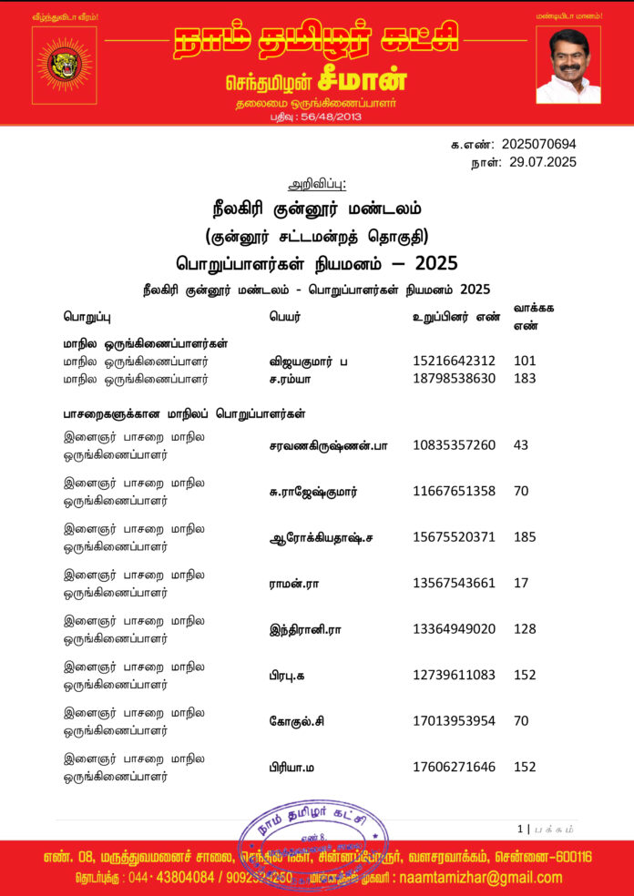 மேற்காண் அனைவரும் நாம் தமிழர் கட்சி – நீலகிரி குன்னூர் மண்டலத்திற்குட்பட்ட பொறுப்பாளர்களாக நியமிக்கப்படுகிறார்கள். இவர்கள் அனைவருக்கும், கட்சியின் அனைத்துநிலைப் பொறுப்பாளர்களும், அன்பு உறவுகள் அனைவரும் முழு ஒத்துழைப்பு நல்குமாறு அன்போடு கேட்டுக் கொள்ளப்படுகிறார்கள்.