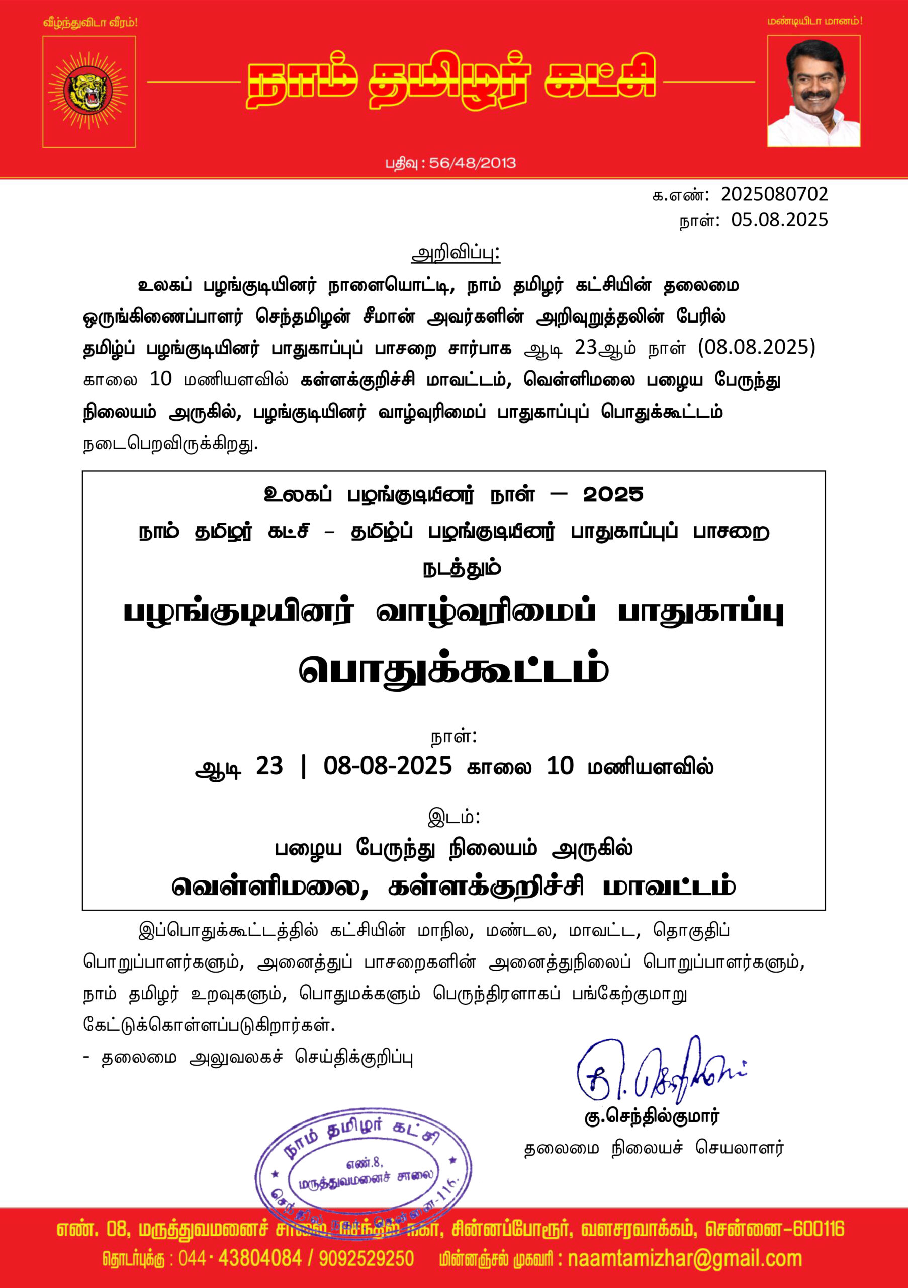 தமிழ்ப் பழங்குடியினர் பாதுகாப்புப் பாசறை சார்பாக ஆடி 23ஆம் நாள் (08.08.2025) காலை 10 மணியளவில் கள்ளக்குறிச்சி மாவட்டம், வெள்ளிமலை பழைய பேருந்து நிலையம் அருகில், பழங்குடியினர் வாழ்வுரிமைப் பாதுகாப்புப் பொதுக்கூட்டம் நடைபெறவிருக்கிறது.