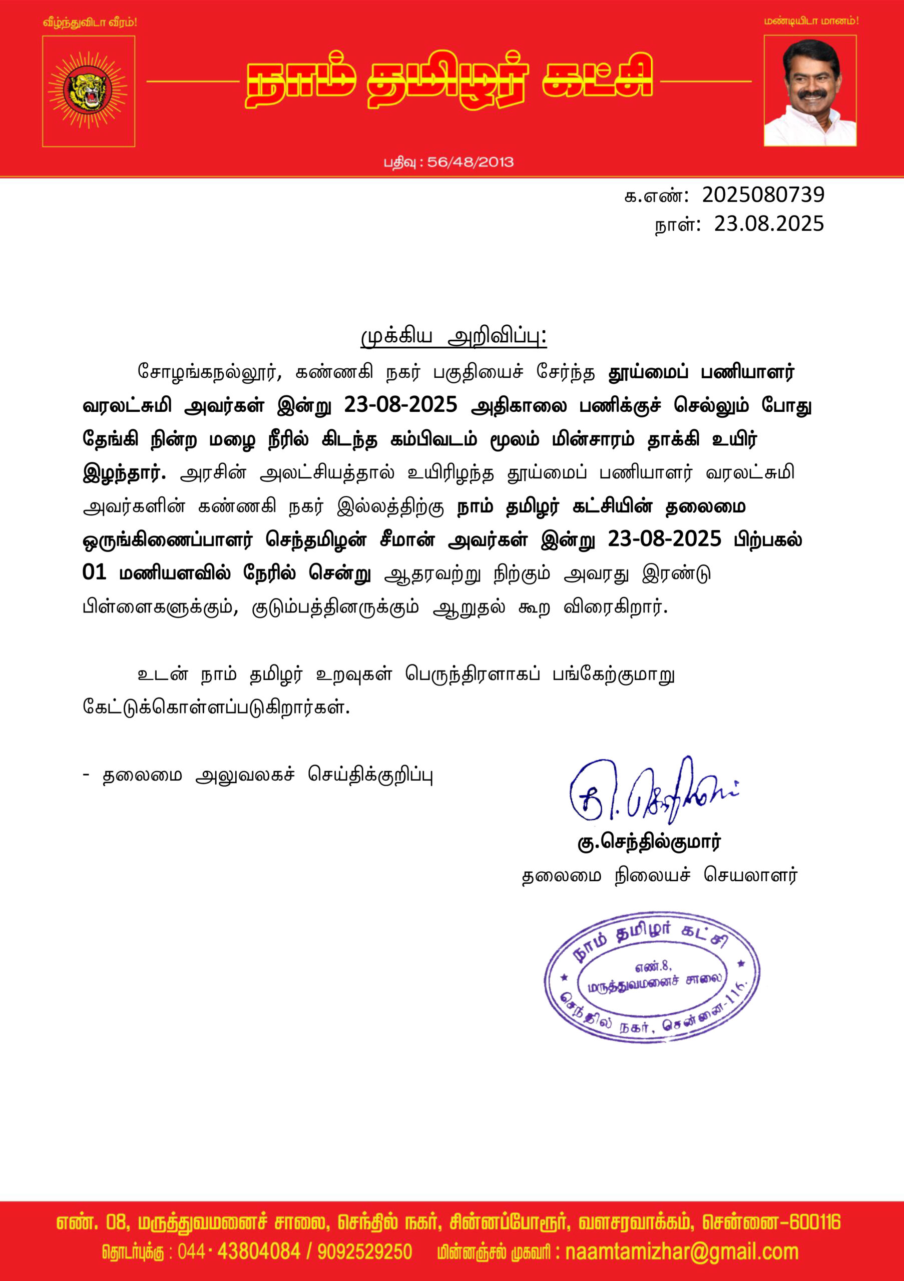 சோழங்கநல்லூர், கண்ணகி நகர் பகுதியைச் சேர்ந்த தூய்மைப் பணியாளர் வரலட்சுமி அவர்கள் இன்று 23-08-2025 அதிகாலை பணிக்குச் செல்லும் போது தேங்கி நின்ற மழை நீரில் கிடந்த கம்பிவடம் மூலம் மின்சாரம் தாக்கி உயிர் இழந்தார். அரசின் அலட்சியத்தால் உயிரிழந்த தூய்மைப் பணியாளர் வரலட்சுமி அவர்களின் கண்ணகி நகர் இல்லத்திற்கு நாம் தமிழர் கட்சியின் தலைமை ஒருங்கிணைப்பாளர் செந்தமிழன் சீமான் அவர்கள் இன்று 23-08-2025 பிற்பகல் 01 மணியளவில் நேரில் சென்று ஆதரவற்று நிற்கும் அவரது இரண்டு பிள்ளைகளுக்கும், குடும்பத்தினருக்கும் ஆறுதல் கூற விரைகிறார்.