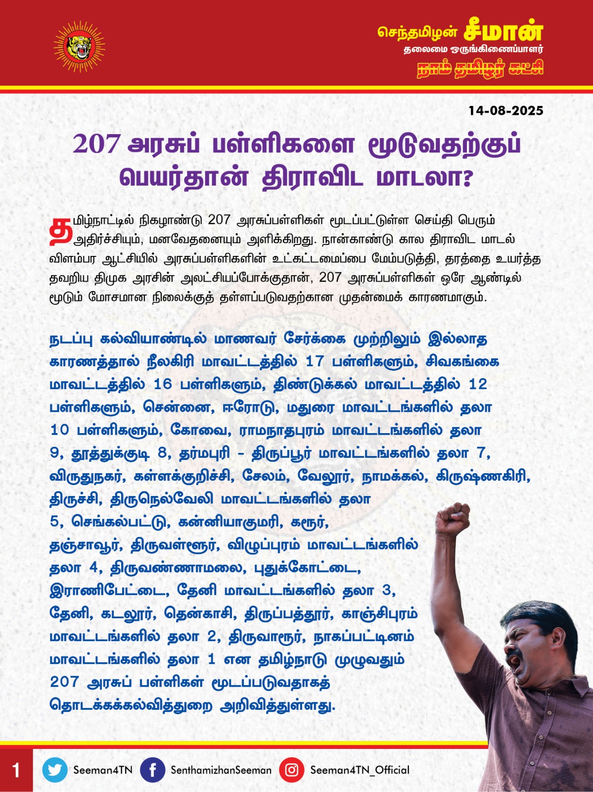 தமிழ்நாட்டில் நிகழாண்டு 207 அரசுப்பள்ளிகள் மூடப்பட்டுள்ள செய்தி பெரும் அதிர்ச்சியும், மனவேதனையும் அளிக்கிறது. நான்காண்டு கால திராவிட மாடல் விளம்பர ஆட்சியில் அரசுப்பள்ளிகளின் உட்கட்டமைப்பை மேம்படுத்தி, தரத்தை உயர்த்த தவறிய திமுக அரசின் அலட்சியப்போக்குதான், 207 அரசுப்பள்ளிகள் ஒரே ஆண்டில் மூடும் மோசமான நிலைக்குத் தள்ளப்படுவதற்கான முதன்மைக் காரணமாகும்.