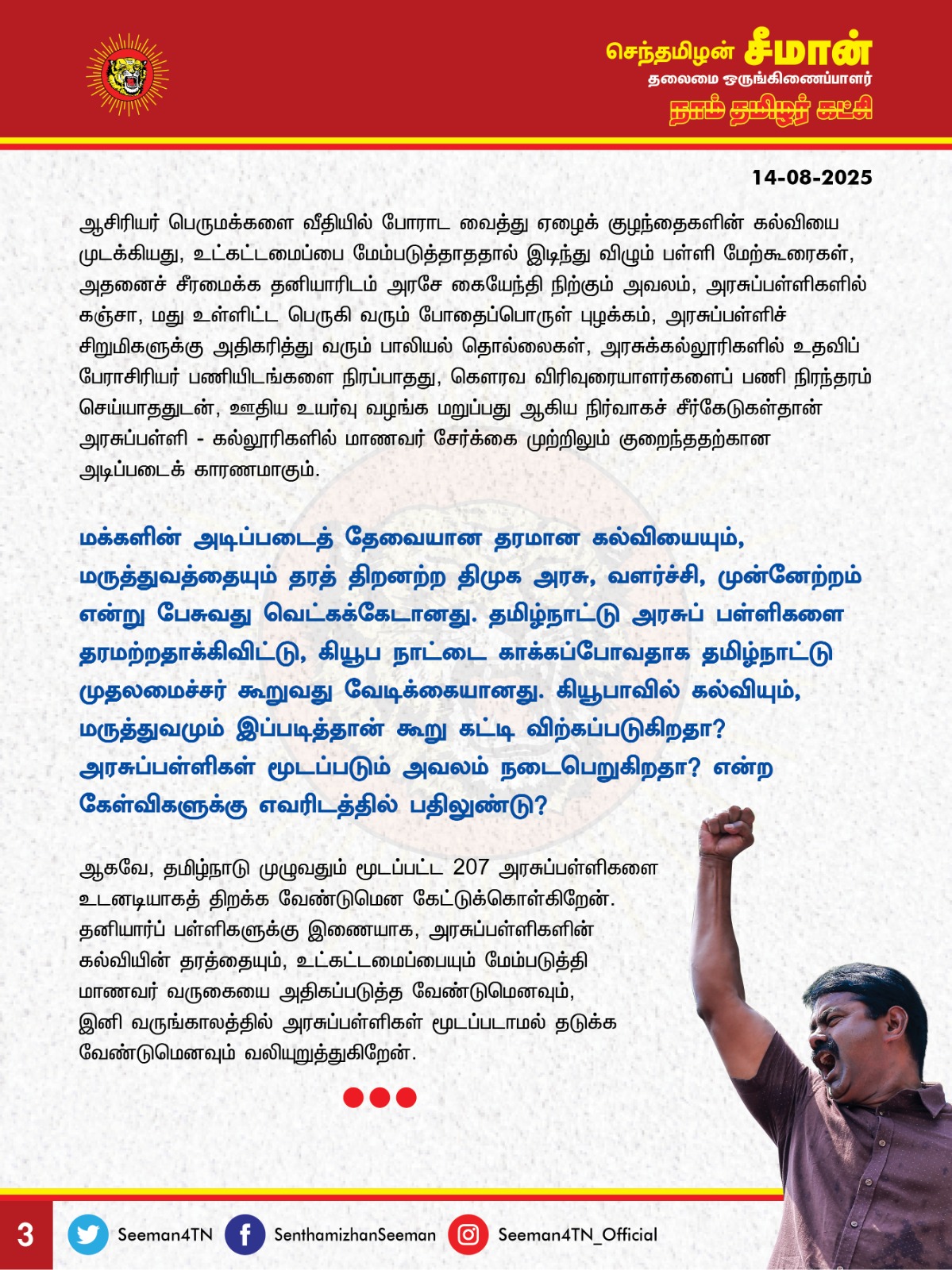 ஒரு நல்ல அரசின் கடமை மாணவச்செல்வங்களுக்குத் தரமான கல்வியைத் தருவதே அன்றி பணத்தைக் கொடுப்பதல்ல; தரமான கல்வியும், அதற்கேற்ற வேலையும் வழங்கினால் எதிர்காலத்தில் எத்தனை ஆயிரங்களை வேண்டுமானாலும் எம் தலைமுறை பிள்ளைகளால் சம்பாதித்துக் கொள்ள முடியும். ஆனால், அரசுப்பள்ளிகளில் காலிப்பணியிடங்களை நிரப்பாததால் நிலவும் ஆசிரியர் பற்றாக்குறை, உரிய ஊதியம் வழங்காமல் ஆசிரியர் பெருமக்களை வீதியில் போராட வைத்து ஏழைக் குழந்தைகளின் கல்வியை முடக்கியது, உட்கட்டமைப்பை மேம்படுத்தாததால் இடிந்து விழும் பள்ளி மேற்கூரைகள், அதனைச் சீரமைக்க தனியாரிடம் அரசே கையேந்தி நிற்கும் அவலம், அரசுப்பள்ளிகளில் கஞ்சா, மது உள்ளிட்ட பெருகி வரும் போதைப்பொருள் புழக்கம், அரசுப்பள்ளிச் சிறுமிகளுக்கு அதிகரித்து வரும் பாலியல் தொல்லைகள், அரசுக்கல்லூரிகளில் உதவிப் பேராசிரியர் பணியிடங்களை நிரப்பாதது, கௌரவ விரிவுரையாளர்களைப் பணி நிரந்தரம் செய்யாததுடன், ஊதிய உயர்வு வழங்க மறுப்பது ஆகிய நிர்வாகச் சீர்கேடுகள்தான் அரசுப்பள்ளி – கல்லூரிகளில் மாணவர் சேர்க்கை முற்றிலும் குறைந்ததற்கான அடிப்படைக் காரணமாகும்.
