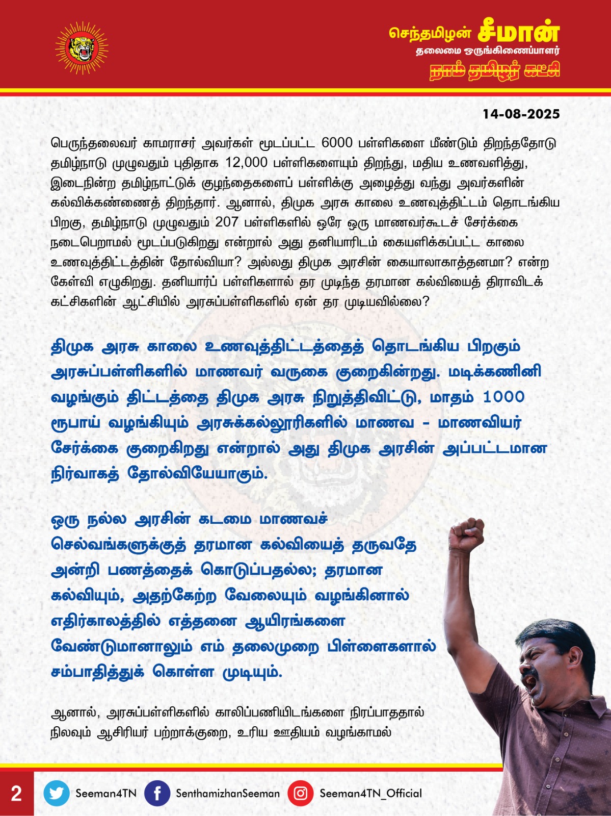 பெருந்தலைவர் காமராசர் அவர்கள் மூடப்பட்ட 6000 பள்ளிகளை மீண்டும் திறந்ததோடு தமிழ்நாடு முழுவதும் புதிதாக 12,000 பள்ளிகளையும் திறந்து, மதிய உணவளித்து, இடைநின்ற தமிழ்நாட்டுக் குழந்தைகளைப் பள்ளிக்கு அழைத்து வந்து அவர்களின் கல்விக்கண்ணைத் திறந்தார். ஆனால், திமுக அரசு காலை உணவுத்திட்டம் தொடங்கிய பிறகு, தமிழ்நாடு முழுவதும் 207 பள்ளிகளில் ஒரே ஒரு மாணவர்கூடச் சேர்க்கை நடைபெறாமல் மூடப்படுகிறது என்றால் அது தனியாரிடம் கையளிக்கப்பட்ட காலை உணவுத்திட்டத்தின் தோல்வியா? அல்லது திமுக அரசின் கையாலாகத்தனமா? என்ற கேள்வி எழுகிறது. தனியார்ப் பள்ளிகளால் தரமுடிந்த தரமான கல்வியைத் திராவிடக் கட்சிகளின் ஆட்சியில் அரசுப்பள்ளிகளில் ஏன் தரமுடியவில்லை?