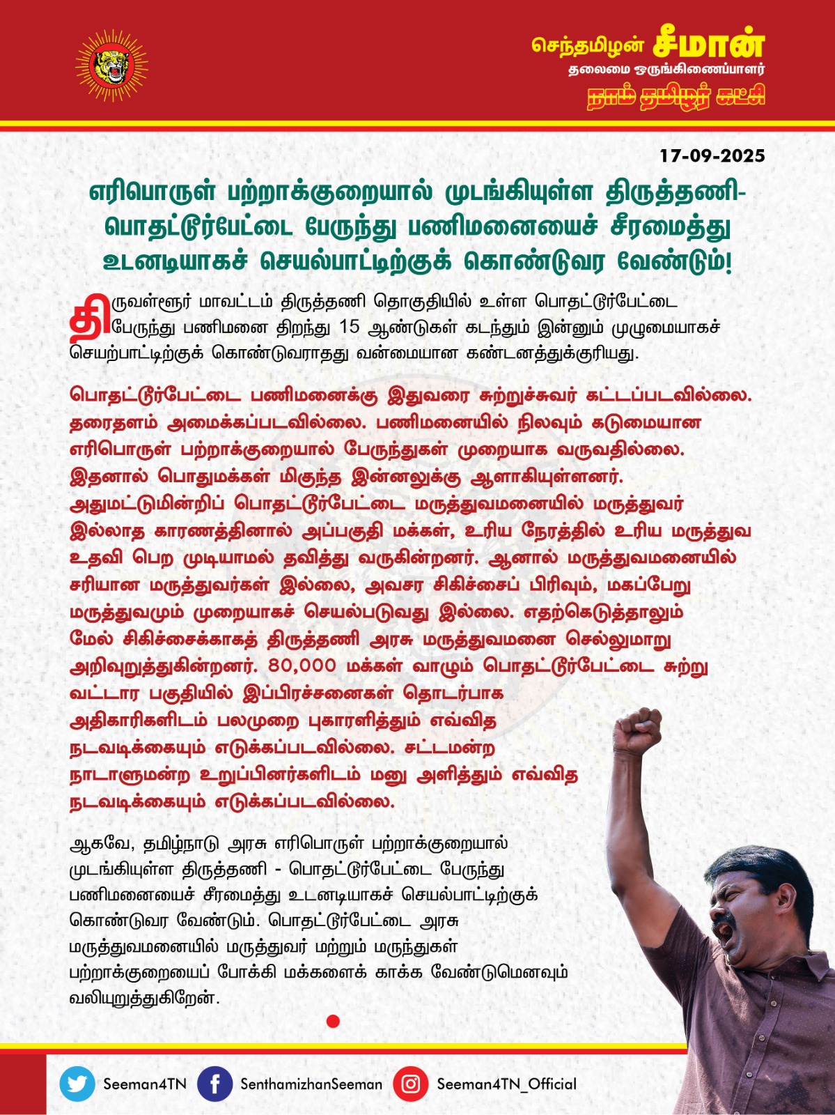 ஆகவே, தமிழ்நாடு அரசு எரிபொருள் பற்றாக்குறையால் முடங்கியுள்ள திருத்தணி – பொதட்டூர்பேட்டை பேருந்து பணிமனையைச் சீரமைத்து உடனடியாகச் செயல்பாட்டிற்குக் கொண்டுவர வேண்டும். பொதட்டூர்பேட்டை அரசு மருத்துவமனையில் மருத்துவர் மற்றும் மருந்துகள் பற்றாக்குறையைப் போக்கி மக்களைக் காக்க வேண்டுமெனவும் வலியுறுத்துகிறேன்.