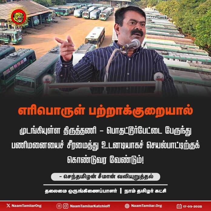 எரிபொருள் பற்றாக்குறையால் முடங்கியுள்ள திருத்தணி-பொதட்டூர்பேட்டை பேருந்து பணிமனையைச் சீரமைத்து உடனடியாகச் செயல்பாட்டிற்குக் கொண்டுவர வேண்டும்! – சீமான் வலியுறுத்தல்