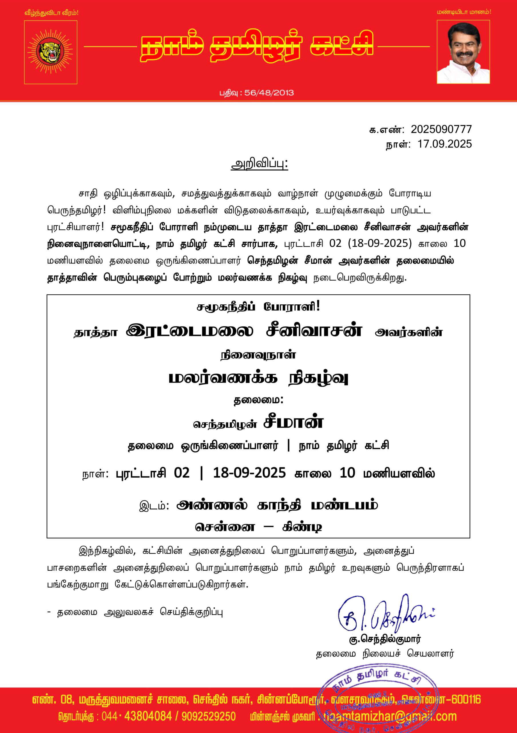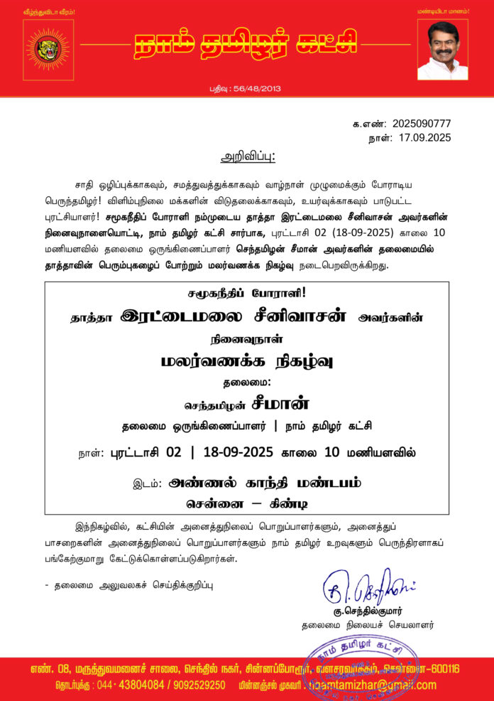 சாதி ஒழிப்புக்காகவும், சமத்துவத்துக்காகவும் வாழ்நாள் முழுமைக்கும் போராடிய பெருந்தமிழர்! விளிம்புநிலை மக்களின் விடுதலைக்காகவும், உயர்வுக்காகவும் பாடுபட்ட புரட்சியாளர்! சமூகநீதிப் போராளி நம்முடைய தாத்தா இரட்டைமலை சீனிவாசன் அவர்களின் நினைவுநாளையொட்டி, நாம் தமிழர் கட்சி சார்பாக, புரட்டாசி 02 (18-09-2025) காலை 10 மணியளவில் தலைமை ஒருங்கிணைப்பாளர் செந்தமிழன் சீமான் அவர்களின் தலைமையில் தாத்தாவின் பெரும்புகழைப் போற்றும் மலர்வணக்க நிகழ்வு நடைபெறவிருக்கிறது.