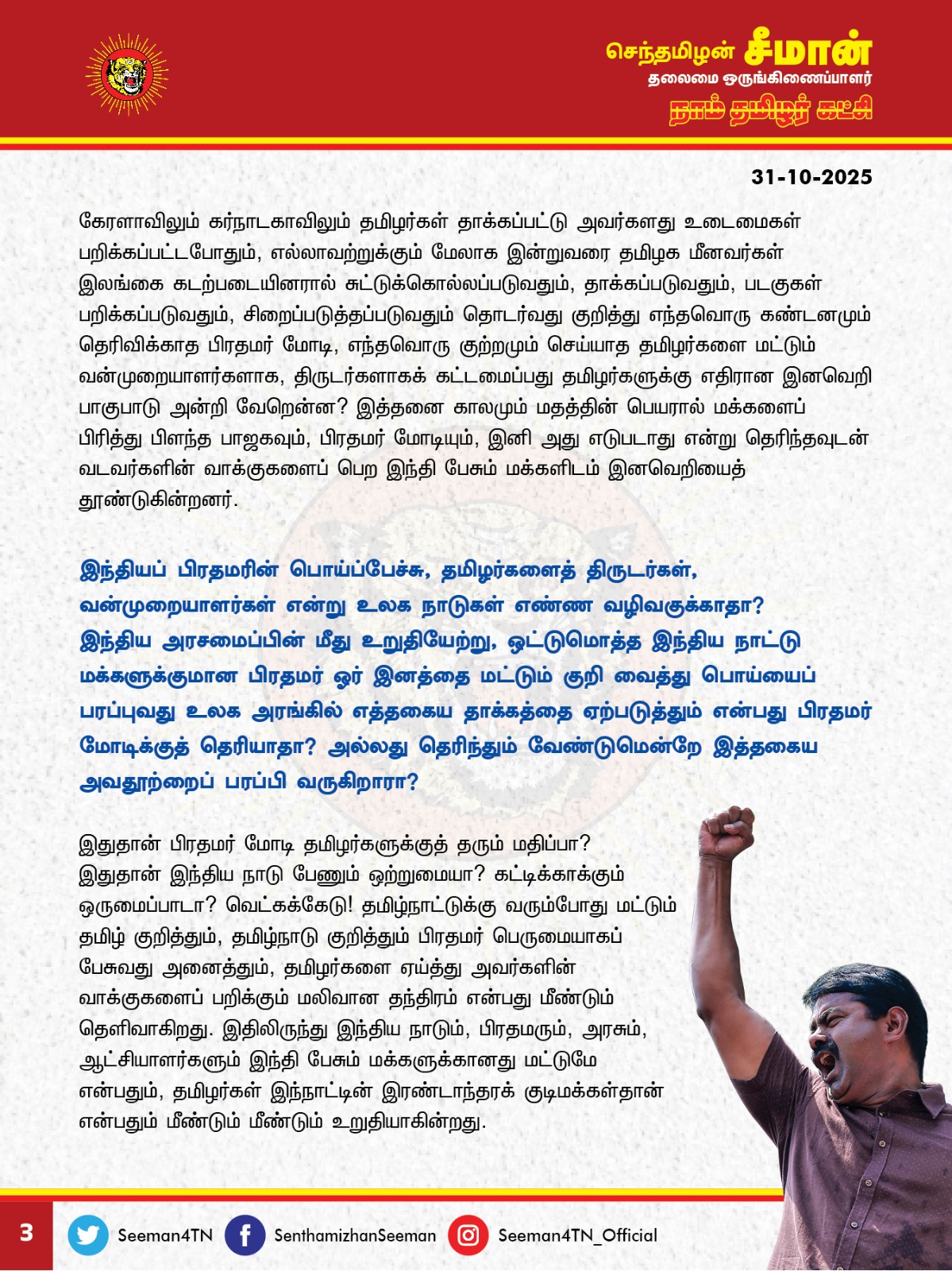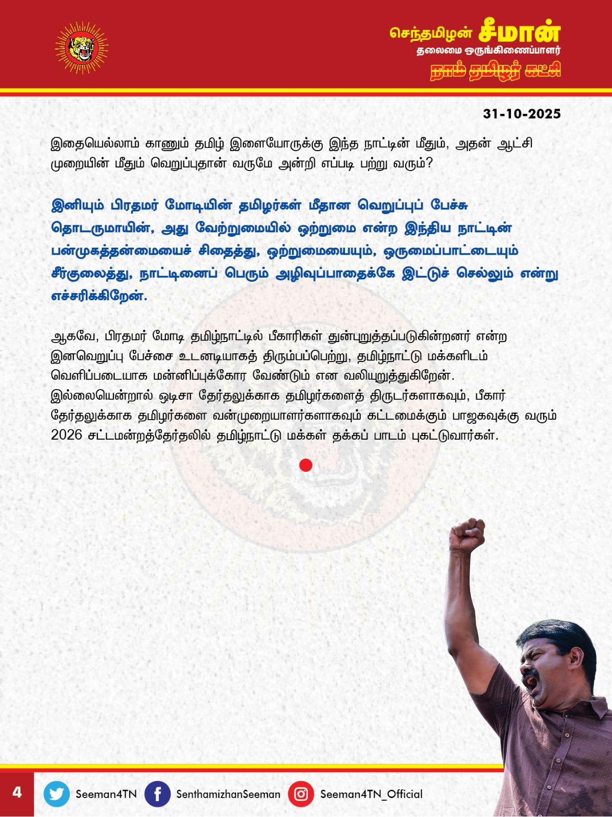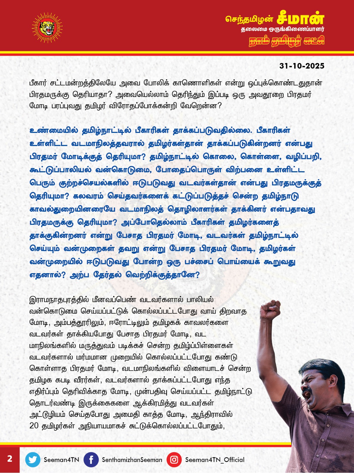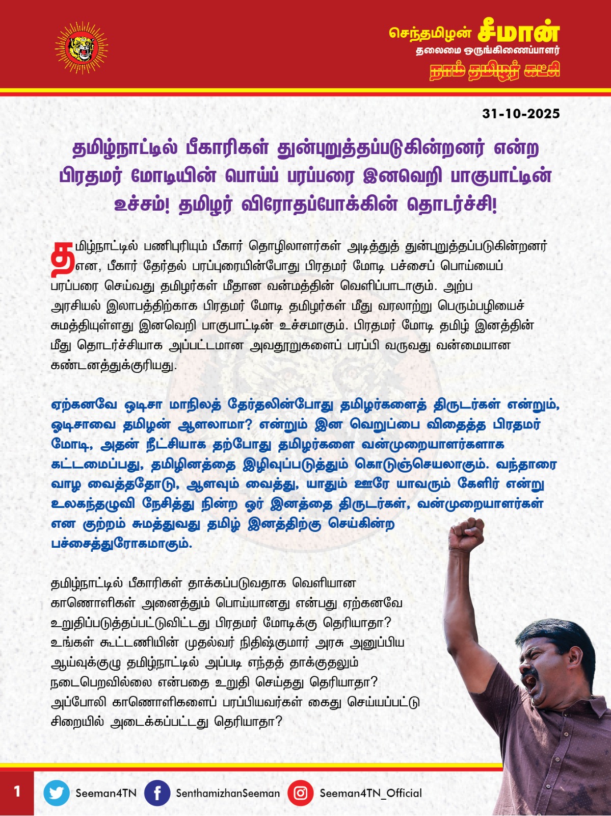 தமிழ்நாட்டில் பணிபுரியும் பீகார் தொழிலாளர்கள் அடித்துத் துன்புறுத்தப்படுகின்றனர் என, பீகார் தேர்தல் பரப்புரையின் போது பிரதமர் மோடி பச்சைப் பொய்யைப் பரப்பரை செய்வது தமிழர்கள் மீதான வன்மத்தின் வெளிப்பாடாகும். அற்ப அரசியல் இலாபத்திற்காக பிரதமர் மோடி தமிழர்கள் மீது வரலாற்று பெரும்பழியைச் சுமத்தியுள்ளது இனவெறி பாகுபாட்டின் உச்சமாகும். பிரதமர் மோடி தமிழ் இனத்தின் மீது தொடர்ச்சியாக அப்பட்டமான அவதூறுகளைப் பரப்பி வருவது வன்மையான கண்டனத்துக்குரியது.