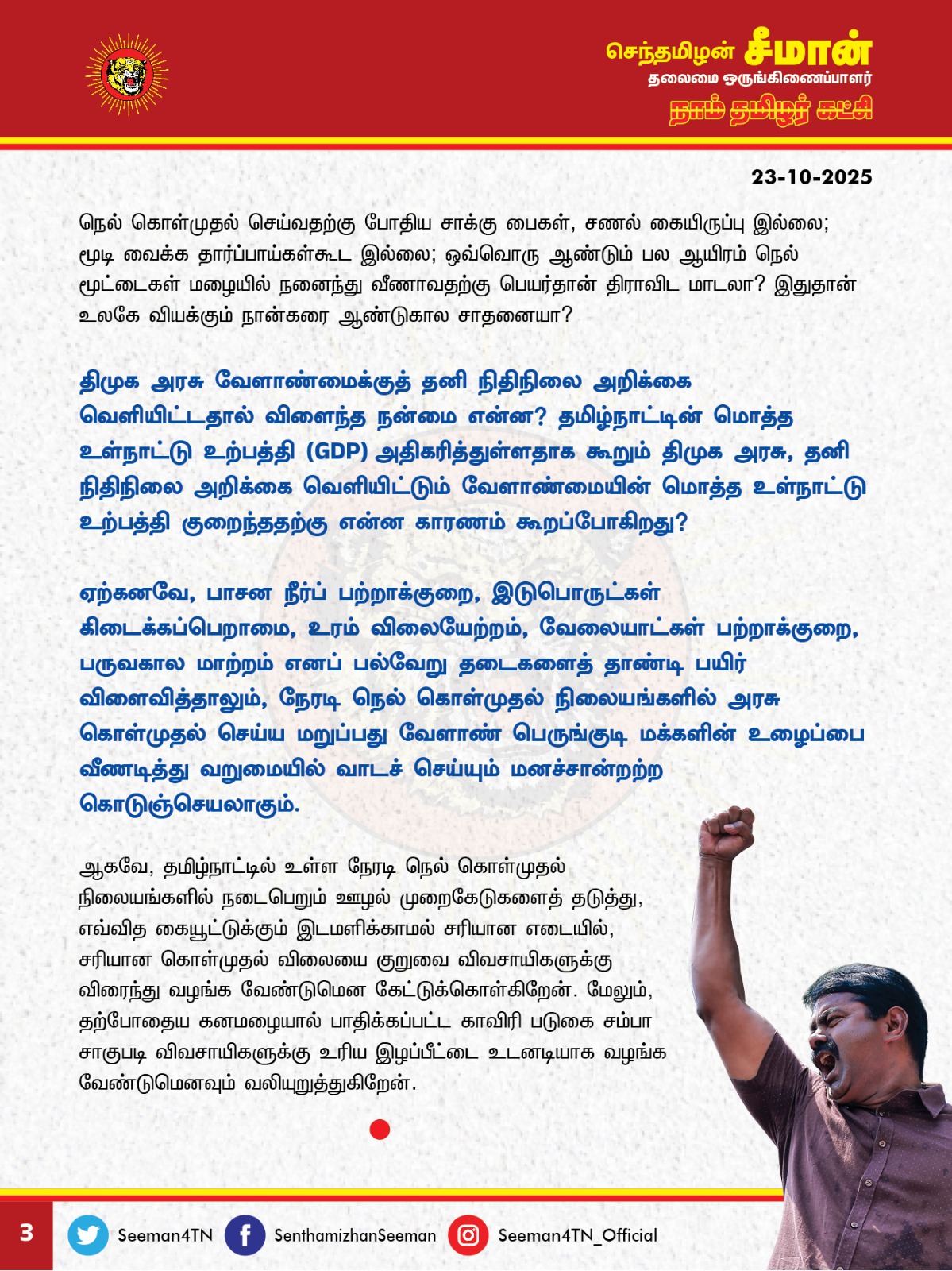 இரத்தத்தை வியர்வையாகச் சிந்தி, வெயிலிலும் மழையிலும் தங்கள் கடின உழைப்பினால் விளைவித்த நெல்மணிகளுக்கு உரிய விலை வேண்டியும், உரிய விவசாயிகள் காலங்காலமாகப் போராடி வருகின்றனர். ஆனால், திராவிட மாடல் திமுக அரசு உற்பத்தி செலவுக்கு இணையான, மிகக்குறைந்த கொள்முதல் விலையை மட்டுமே நிர்ணயித்து விவசாயிகள் வயிற்றில் அடித்து வருகின்றது. அக்குறைந்தபட்ச கொள்முதல் விலையிலும் உரிய நேரத்தில் நெல் கொள்முதலை திமுக அரசு செய்ய மறுப்பதுதான் கொடுமையிலும் பெருங்கொடுமை.