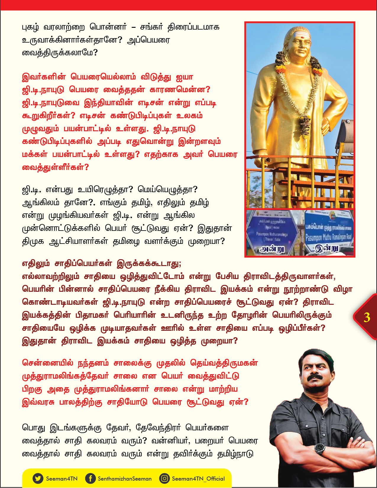 எதிலும் சாதிப்பெயர்கள் இருக்கக்கூடாது; எல்லாவற்றிலும் சாதியை ஒழித்துவிட்டோம் என்று பேசிய திராவிடத்திருவாளர்கள், பெயரின் பின்னால் சாதிப்பெயரை நீக்கிய திராவிட இயக்கம் என்று நூற்றாண்டு விழா கொண்டாடியவர்கள் ஜி.டி.நாயுடு என்ற சாதிப்பெயரைச் சூட்டுவது ஏன்? திராவிட இயக்கத்தின் பிதாமகர் பெரியாரின் உடனிருந்த உற்ற தோழரின் பெயரிலிருக்கும் சாதியையே ஒழிக்க முடியாதவர்கள் ஊரில் உள்ள சாதியை எப்படி ஒழிப்பீர்கள்? இதுதான் திராவிட இயக்கம் சாதியை ஒழித்த முறையா?