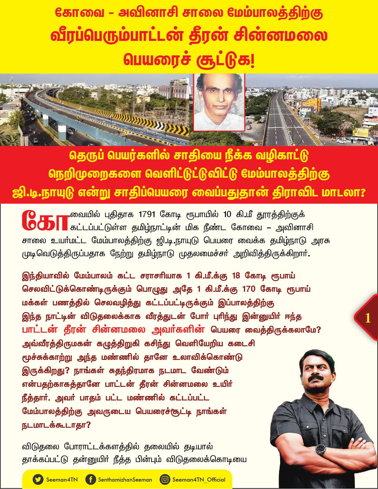 ஆகவே, கோவை – அவினாசி சாலை மேம்பாலத்திற்கு ஐயா ஜி.டி.நாயுடு பெயரை வைக்கும் முடிவை கைவிட்டு, தமிழர்களின் தனிப்பெரும் அடையாளங்களாக, கொங்கு மக்களின் பண்பாட்டுப் பெருமைகளாகத் திகழும் பாட்டன்கள் தீரன் சின்னமலை, கொடி காத்த குமரன், செக்கிழுத்த செம்மல் வ.உ.சிதம்பரனார், முதல் மொழிப்போர் வீரர் பல்லடம் பொன்னுசாமி, மாமன்னர் காலிங்கராயன், அண்ணன்மார் சாமிகளான பொன்னர் – சங்கர் ஆகியோரின் பெயர்களில் ஒன்றைச் சூட்ட வேண்டுமென வலியுறுத்துகிறேன்.