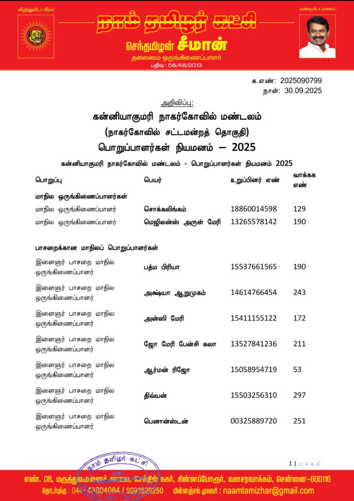 மேற்காண் அனைவரும் நாம் தமிழர் கட்சி – கன்னியாகுமரி நாகர்கோவில் மண்டலத்திற்குட்பட்ட பொறுப்பாளர்களாக நியமிக்கப்படுகிறார்கள். இவர்கள் அனைவருக்கும், கட்சியின் அனைத்துநிலைப் பொறுப்பாளர்களும், அன்பு உறவுகள் அனைவரும் முழு ஒத்துழைப்பு நல்குமாறு அன்போடு கேட்டுக் கொள்ளப்படுகிறார்கள்.