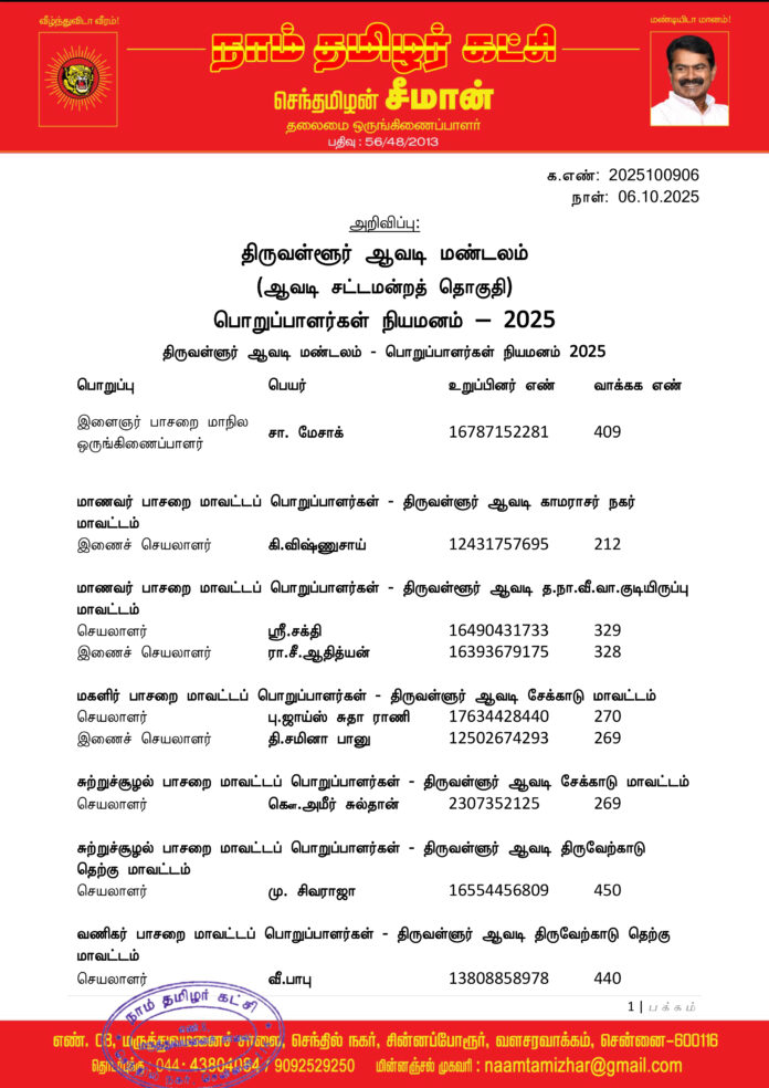 மேற்காண் அனைவரும் நாம் தமிழர் கட்சி – திருவள்ளூர் ஆவடி மண்டலத்திற்குட்பட்ட பொறுப்பாளர்களாக நியமிக்கப்படுகிறார்கள். இவர்கள் அனைவருக்கும், கட்சியின் அனைத்துநிலைப் பொறுப்பாளர்களும், அன்பு உறவுகள் அனைவரும் முழு ஒத்துழைப்பு நல்குமாறு அன்போடு கேட்டுக் கொள்ளப்படுகிறார்கள்.