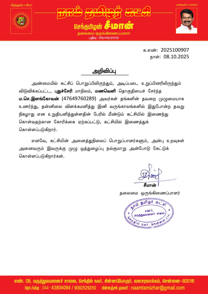 ம.செ.இளங்கோவன் (47649760289) அவர்கள் தங்களின் தவறை முழுமையாக உணர்ந்து, தன்னிலை விளக்கமளித்து இனி வருங்காலங்களில் இதுபோன்ற தவறு நிகழாது என உறுதியளித்துள்ளதின் பேரில் மீண்டும் கட்சியில் இணைந்து கொள்வதற்கான கோரிக்கை ஏற்கப்பட்டு, கட்சியில் இணைத்துக் கொள்ளப்படுகிறார்.