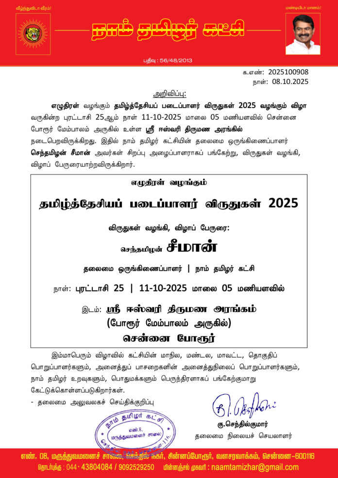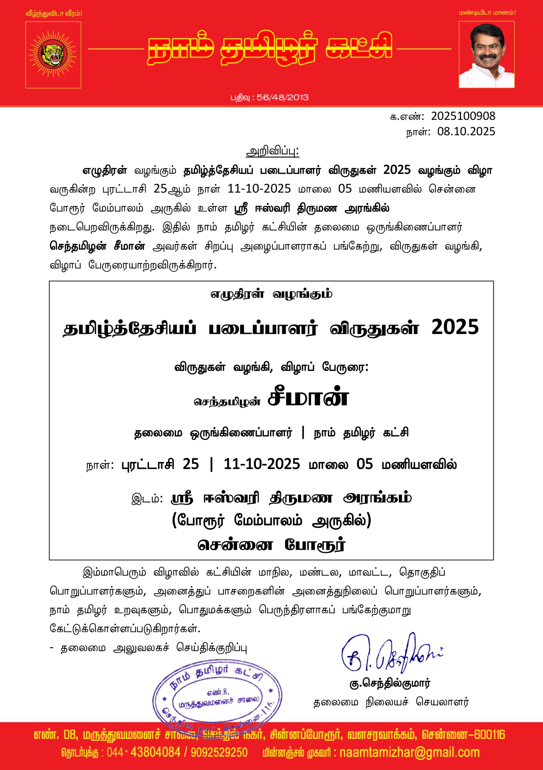 தலைமை அறிவிப்பு – எழுதிரள் வழங்கும் தமிழ்த்தேசியப் படைப்பாளர் விருதுகள் 2025 விருதுகள் வழங்கி, விழாப் பேருரை: செந்தமிழன் சீமான்