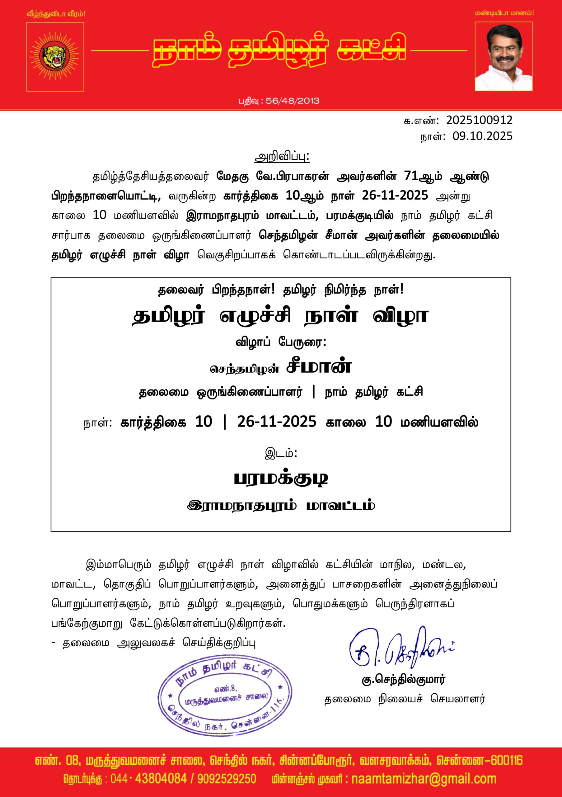 தலைமை ஒருங்கிணைப்பாளர் | நாம் தமிழர் கட்சிநாள்: கார்த்திகை 10 | 26-11-2025 காலை 10 மணியளவில்