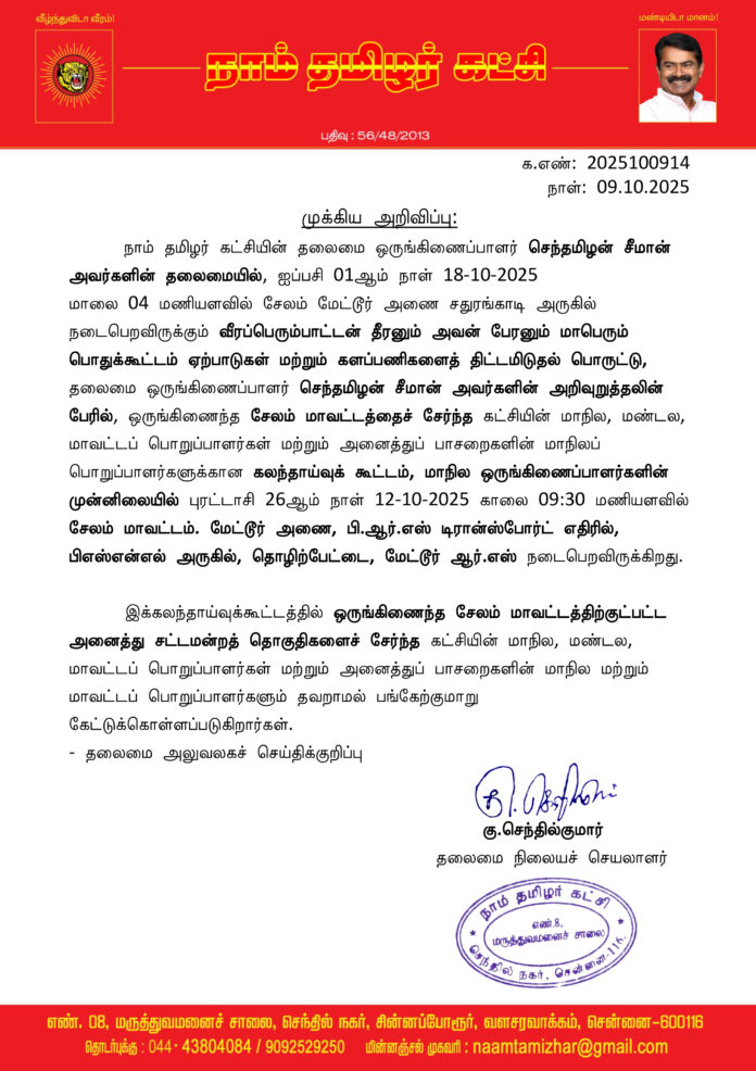 மாலை 04 மணியளவில் சேலம் மேட்டூர் அணை சதுரங்காடி அருகில் நடைபெறவிருக்கும் வீரப்பெரும்பாட்டன் தீரனும் அவன் பேரனும் மாபெரும் பொதுக்கூட்டம் ஏற்பாடுகள் மற்றும் களப்பணிகளைத் திட்டமிடுதல் பொருட்டு, தலைமை ஒருங்கிணைப்பாளர் செந்தமிழன் சீமான் அவர்களின் அறிவுறுத்தலின் பேரில், ஒருங்கிணைந்த சேலம் மாவட்டத்தைச் சேர்ந்த கட்சியின் மாநில, மண்டல, மாவட்டப் பொறுப்பாளர்கள் மற்றும் அனைத்துப் பாசறைகளின் மாநிலப் பொறுப்பாளர்களுக்கான கலந்தாய்வுக் கூட்டம், மாநில ஒருங்கிணைப்பாளர்களின் முன்னிலையில் புரட்டாசி 26ஆம் நாள் 12-10-2025 காலை 09:30 மணியளவில் சேலம் மாவட்டம். மேட்டூர் அணை, பி.ஆர்.எஸ் டிரான்ஸ்போர்ட் எதிரில், பிஎஸ்என்எல் அருகில், தொழிற்பேட்டை, மேட்டூர் ஆர்.எஸ் நடைபெறவிருக்கிறது.