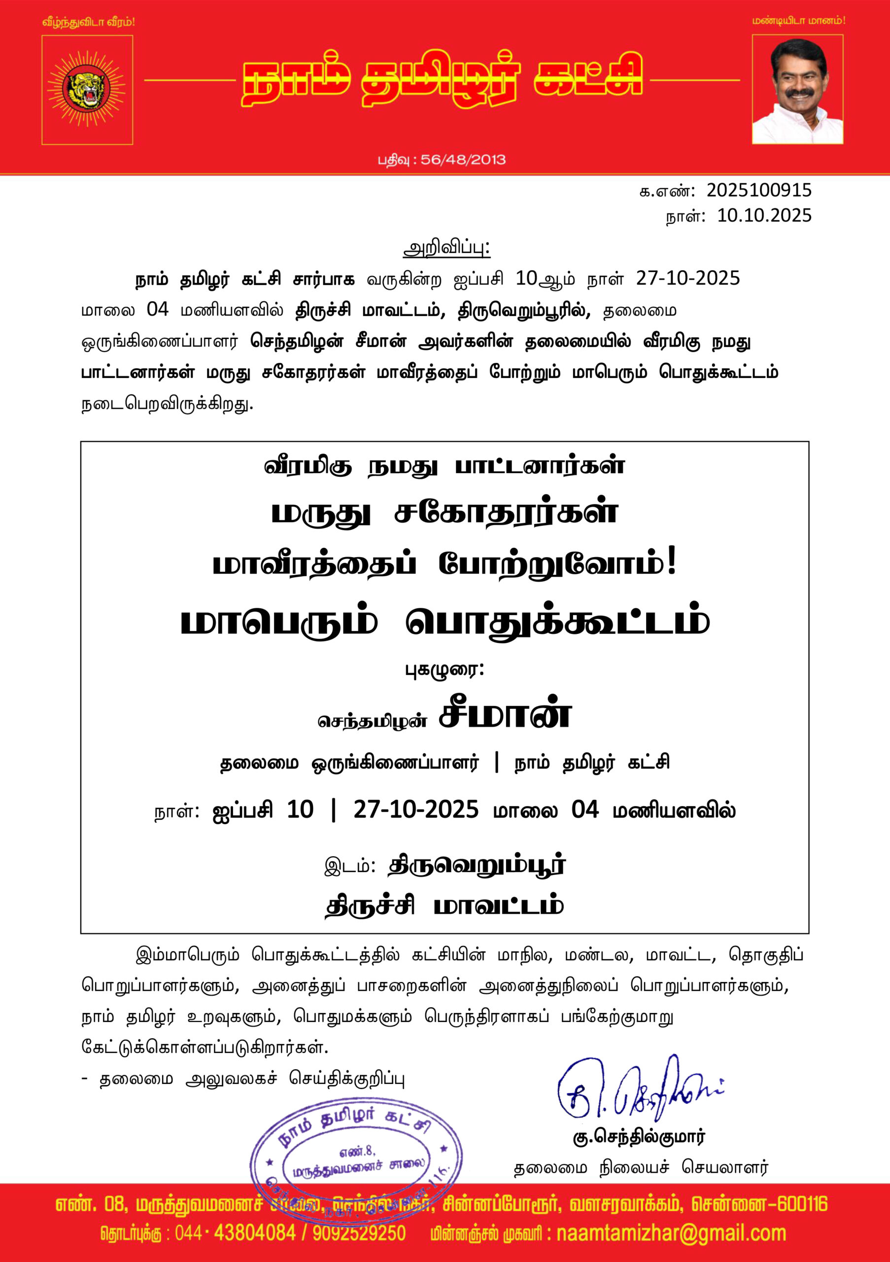 நாம் தமிழர் கட்சி சார்பாக வருகின்ற ஐப்பசி 10ஆம் நாள் 27-10-2025