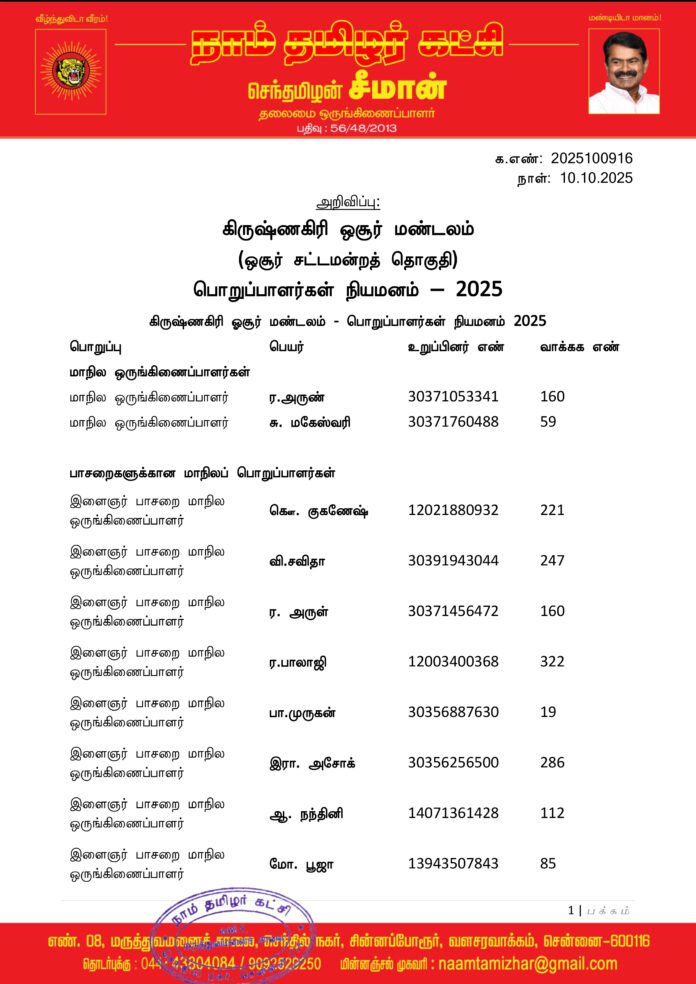 மேற்காண் அனைவரும் நாம் தமிழர் கட்சி – கிருஷ்ணகிரி ஒசூர் மண்டலத்திற்குட்பட்ட பொறுப்பாளர்களாக நியமிக்கப்படுகிறார்கள். இவர்கள் அனைவருக்கும், கட்சியின் அனைத்துநிலைப் பொறுப்பாளர்களும், அன்பு உறவுகள் அனைவரும் முழு ஒத்துழைப்பு நல்குமாறு அன்போடு கேட்டுக் கொள்ளப்படுகிறார்கள்.