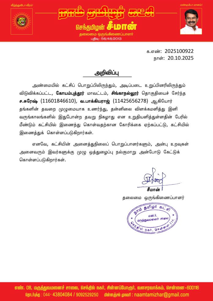 ச.சுரேஷ் (11601846610), வ.பாக்கியராஜ் (11425656278) ஆகியோர் தங்களின் தவறை முழுமையாக உணர்ந்து, தன்னிலை விளக்கமளித்து இனி வருங்காலங்களில் இதுபோன்ற தவறு நிகழாது என உறுதியளித்துள்ளதின் பேரில் மீண்டும் கட்சியில் இணைந்து கொள்வதற்கான கோரிக்கை ஏற்கப்பட்டு, கட்சியில் இணைத்துக் கொள்ளப்படுகிறார்கள்.