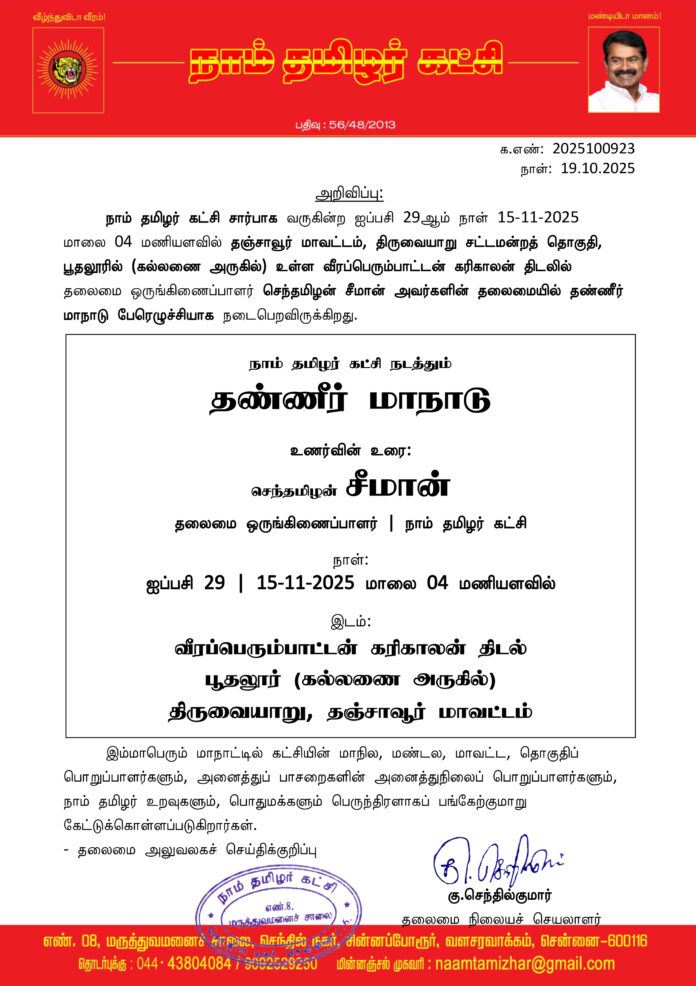 நாம் தமிழர் கட்சி சார்பாக வருகின்ற ஐப்பசி 29ஆம் நாள் 15-11-2025