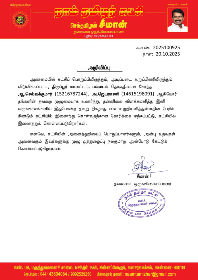 ஆ.செல்வக்குமார் (15216787244), அ.ஜெயராணி (14615198091) ஆகியோர் தங்களின் தவறை முழுமையாக உணர்ந்து, தன்னிலை விளக்கமளித்து இனி வருங்காலங்களில் இதுபோன்ற தவறு நிகழாது என உறுதியளித்துள்ளதின் பேரில் மீண்டும் கட்சியில் இணைந்து கொள்வதற்கான கோரிக்கை ஏற்கப்பட்டு, கட்சியில் இணைத்துக் கொள்ளப்படுகிறார்கள்.