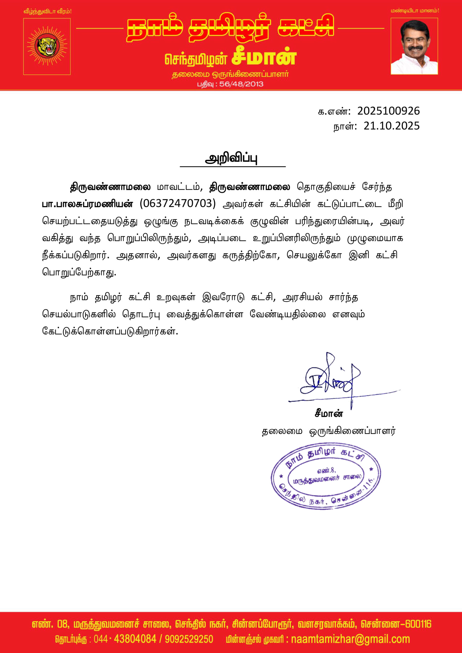 திருவண்ணாமலை மாவட்டம், திருவண்ணாமலை தொகுதியைச் சேர்ந்த பா.பாலசுப்ரமணியன் (06372470703) அவர்கள் கட்சியின் கட்டுப்பாட்டை மீறி செயற்பட்டதையடுத்து ஒழுங்கு நடவடிக்கைக் குழுவின் பரிந்துரையின்படி, அவர் வகித்து வந்த பொறுப்பிலிருந்தும், அடிப்படை உறுப்பினரிலிருந்தும் முழுமையாக நீக்கப்படுகிறார். அதனால், அவர்களது கருத்திற்கோ, செயலுக்கோ இனி கட்சி பொறுப்பேற்காது.