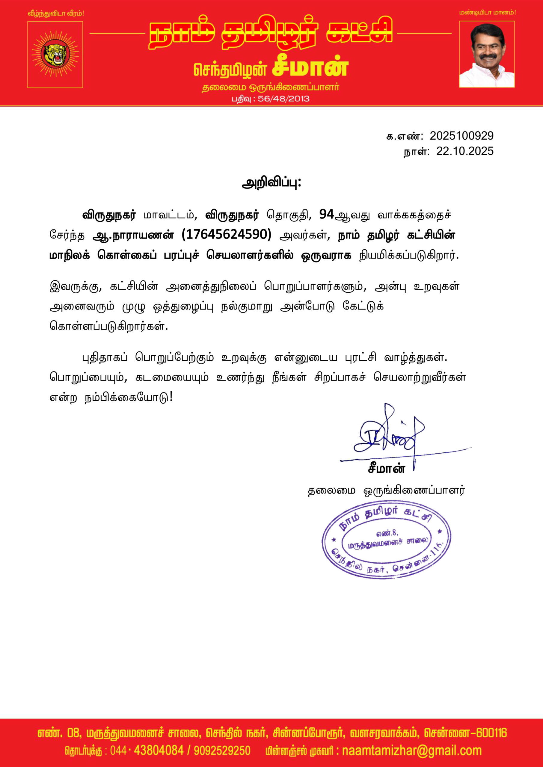 விருதுநகர் மாவட்டம், விருதுநகர் தொகுதி, 94ஆவது வாக்ககத்தைச் சேர்ந்த ஆ.நாராயணன் (17645624590) அவர்கள், நாம் தமிழர் கட்சியின் மாநிலக் கொள்கைப் பரப்புச் செயலாளர்களில் ஒருவராக நியமிக்கப்படுகிறார்.