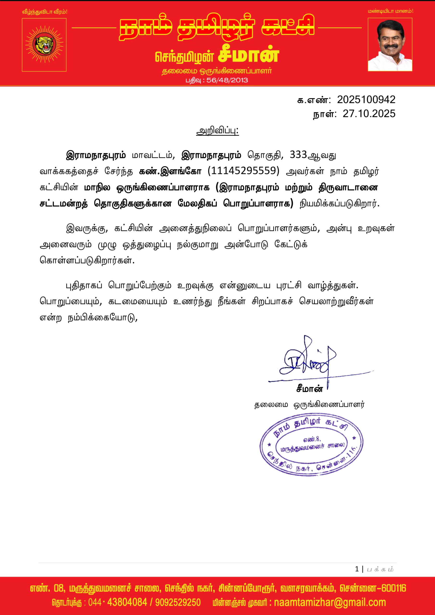 தலைமை அறிவிப்பு – மாநில ஒருங்கிணைப்பாளராக (இராமநாதபுரம் மற்றும் திருவாடானை சட்டமன்றத் தொகுதிகளுக்கான மேலதிகப் பொறுப்பாளராக) நியமனம்