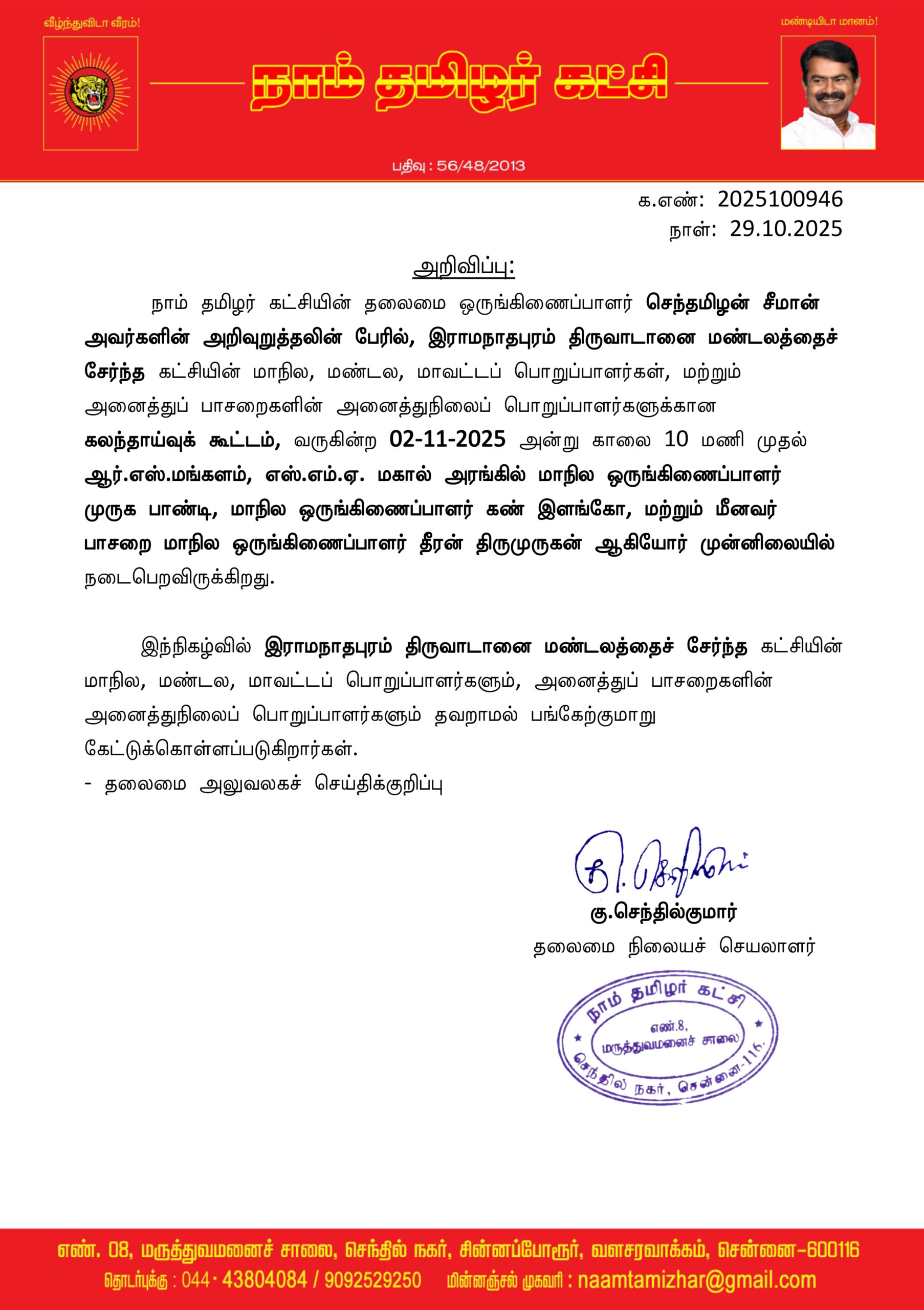 கலந்தாய்வுக் கூட்டம், வருகின்ற 02-11-2025 அன்று காலை 10 மணி முதல் ஆர்.எஸ்.மங்களம், எஸ்.எம்.ஏ. மகால் அரங்கில் மாநில ஒருங்கிணைப்பாளர் முருக பாண்டி, மாநில ஒருங்கிணைப்பாளர் கண் இளங்கோ, மற்றும் மீனவர் பாசறை மாநில ஒருங்கிணைப்பாளர் தீரன் திருமுருகன் ஆகியோர் முன்னிலையில் நடைபெறவிருக்கிறது.