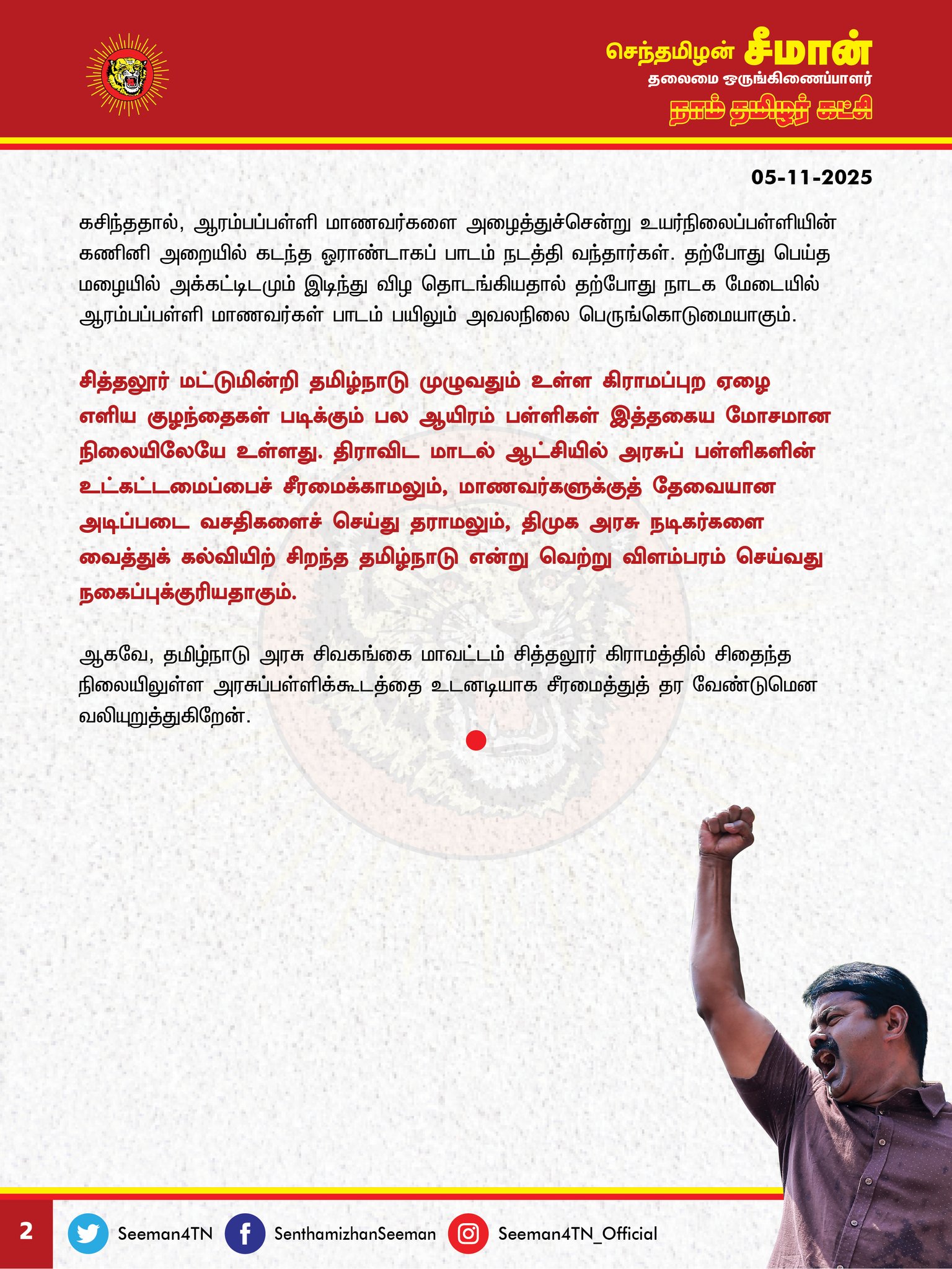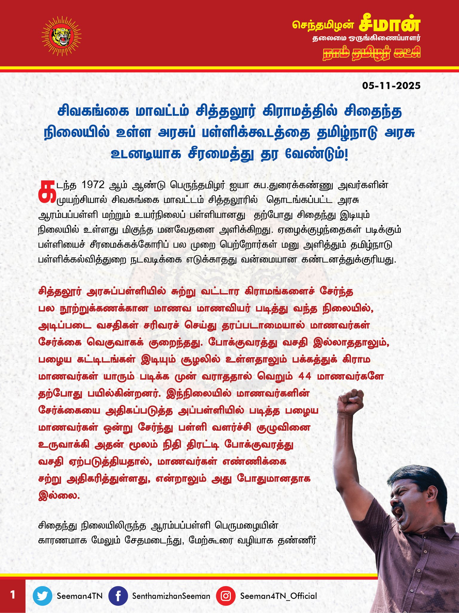 சிவகங்கை மாவட்டம் சித்தலூர் கிராமத்தில் சிதைந்த நிலையில் உள்ள அரசுப்பள்ளிக்கூடத்தை தமிழ்நாடு அரசு உடனடியாக சீரமைத்து தர வேண்டும்! – சீமான் வலியுறுத்தல்
