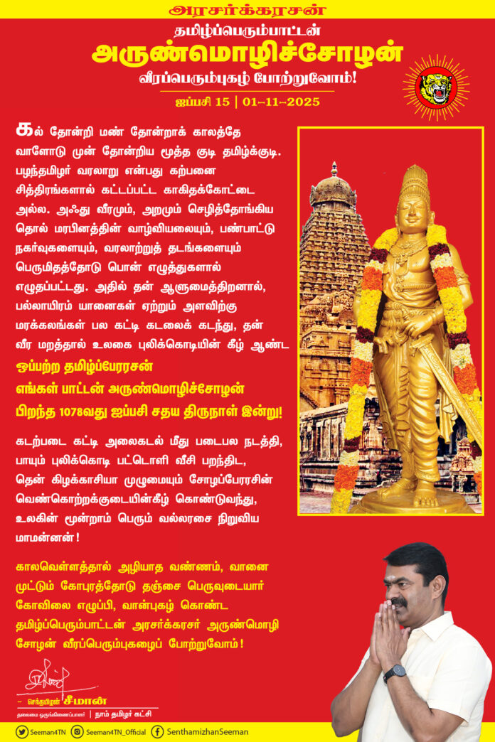 கல் தோன்றி மண் தோன்றாக் காலத்தே வாளோடு முன் தோன்றிய மூத்த குடி தமிழ்க்குடி. பழந்தமிழர் வரலாறு என்பது கற்பனை சித்திரங்களால் கட்டப்பட்ட காகிதக்கோட்டை அல்ல. அஃது வீரமும், அறமும் செழித்தோங்கிய தொல் மரபினத்தின் வாழ்வியலையும், பண்பாட்டு நகர்வுகளையும், வரலாற்றுத் தடங்களையும் பெருமிதத்தோடு பொன் எழுத்துகளால் எழுதப்பட்டது. அதில் தன் ஆளுமைத்திறனால், பல்லாயிரம் யானைகள் ஏற்றும் அளவிற்கு மரக்கலங்கள் பல கட்டி கடலைக் கடந்து, தன் வீர மறத்தால் உலகை புலிக்கொடியின் கீழ் ஆண்ட ஒப்பற்ற தமிழ்ப்பேரரசன் எங்கள் பாட்டன் அருண்மொழிச்சோழன் பிறந்த 1078வது ஐப்பசி சதய திருநாள் இன்று!