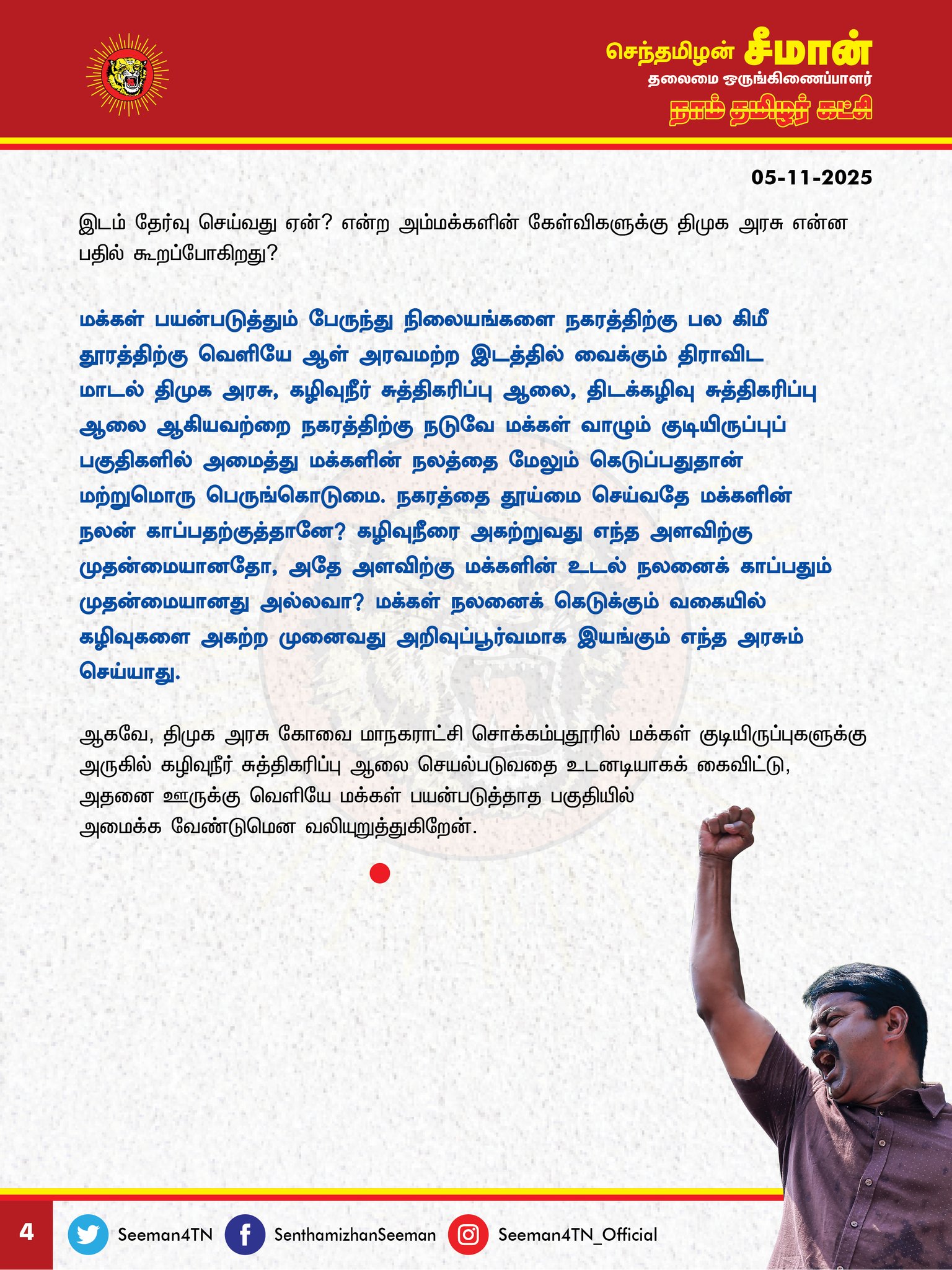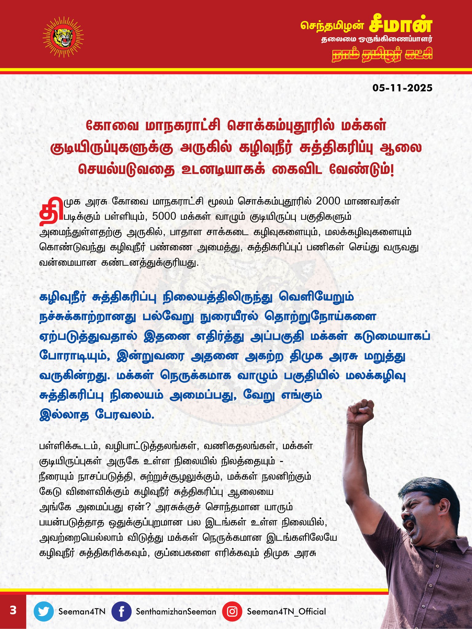 கோவை மாநகராட்சி சொக்கம்புதூரில் மக்கள் குடியிருப்புகளுக்கு அருகில் கழிவுநீர் சுத்திகரிப்பு ஆலை செயல்படுவதை உடனடியாகக் கைவிட வேண்டும்! – சீமான் வலியுறுத்தல்
