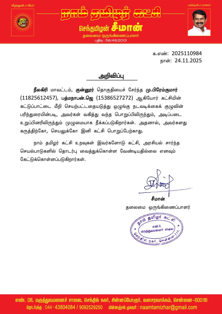 நீலகிரி மாவட்டம், குன்னூர் தொகுதியைச் சேர்ந்த மு.பிரேம்குமார் (11825612457), பத்மநாபன்.ஜெ (15386527272) ஆகியோர் கட்சியின் கட்டுப்பாட்டை மீறி செயற்பட்டதையடுத்து ஒழுங்கு நடவடிக்கைக் குழுவின் பரிந்துரையின்படி, அவர்கள் வகித்து வந்த பொறுப்பிலிருந்தும், அடிப்படை உறுப்பினரிலிருந்தும் முழுமையாக நீக்கப்படுகிறார்கள். அதனால், அவர்களது கருத்திற்கோ, செயலுக்கோ இனி கட்சி பொறுப்பேற்காது.