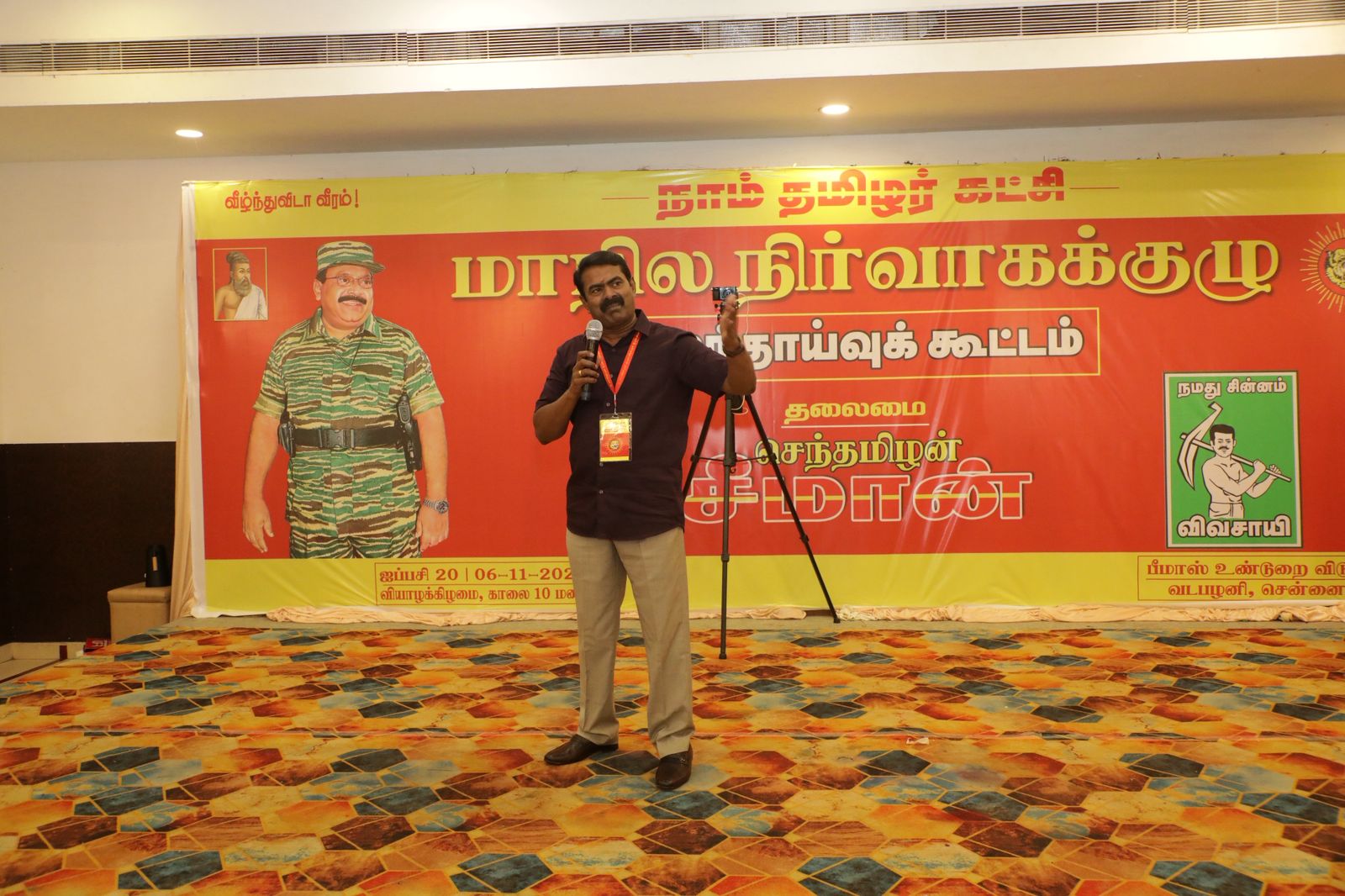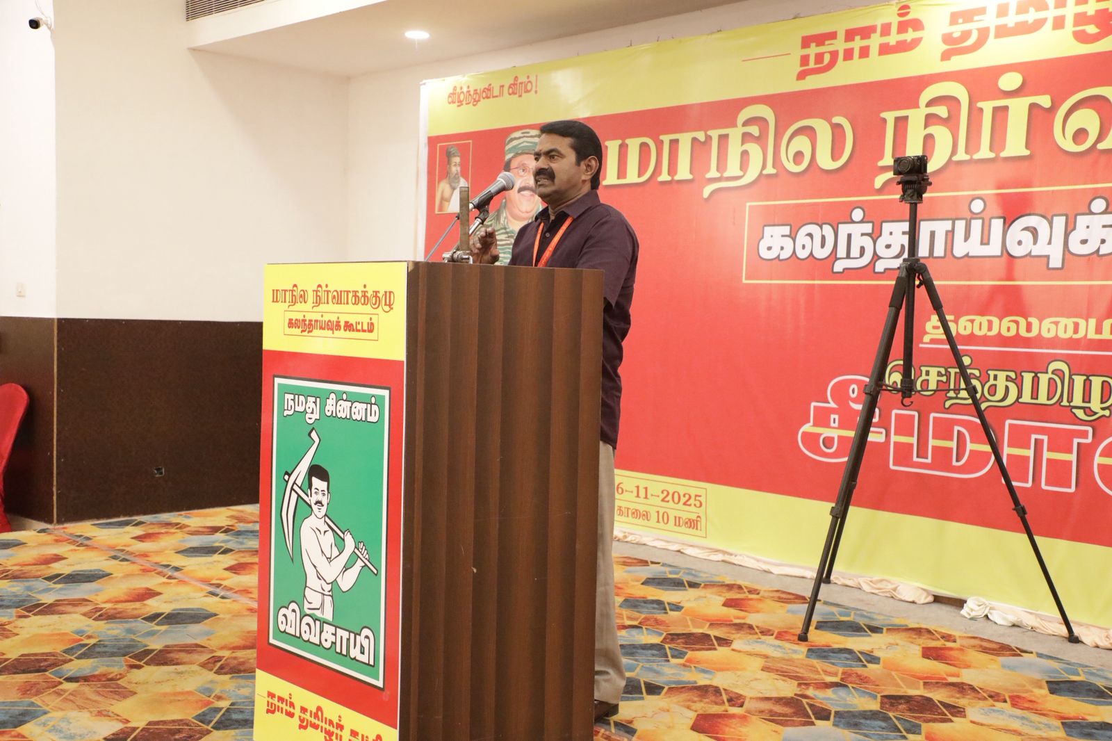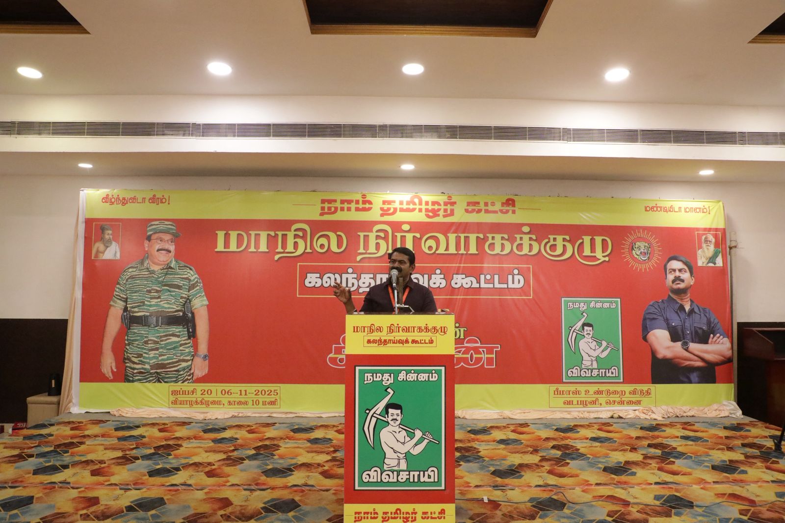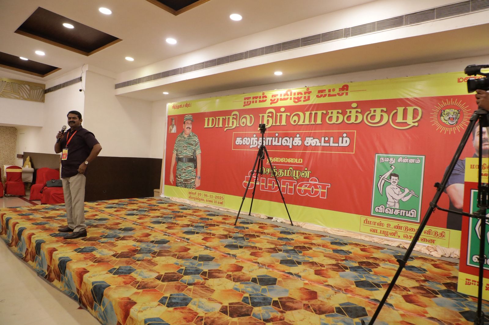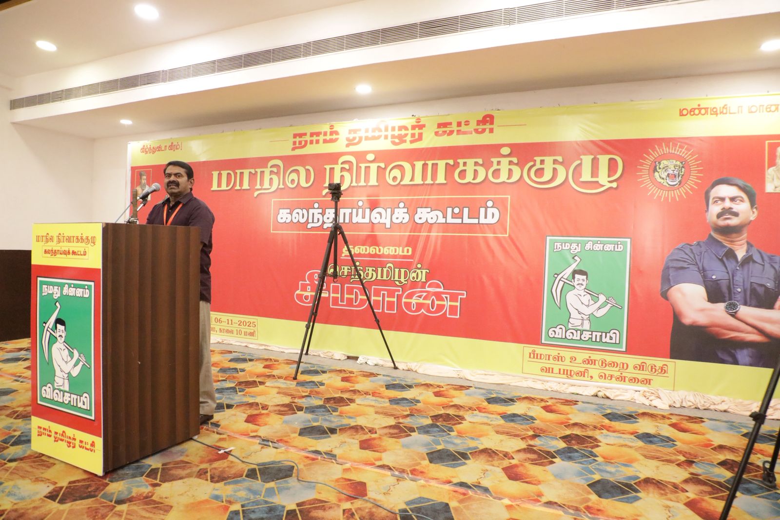 ஐப்பசி 20ஆம் நாள் 06-11-2025 காலை 10 மணியளவில் சென்னை வடபழனியில் அமைந்துள்ள பீமாஸ் உண்டுறை விடுதி (Hotel Bhimaas Temple Tree) அரங்கில் நாம் தமிழர் கட்சியின் தலைமை ஒருங்கிணைப்பாளர் செந்தமிழன் சீமான் அவர்களின் தலைமையில் மாநில நிர்வாகக்குழு உறுப்பினர்களுக்கான கலந்தாய்வுக் கூட்டம் நடைபெற்றது.