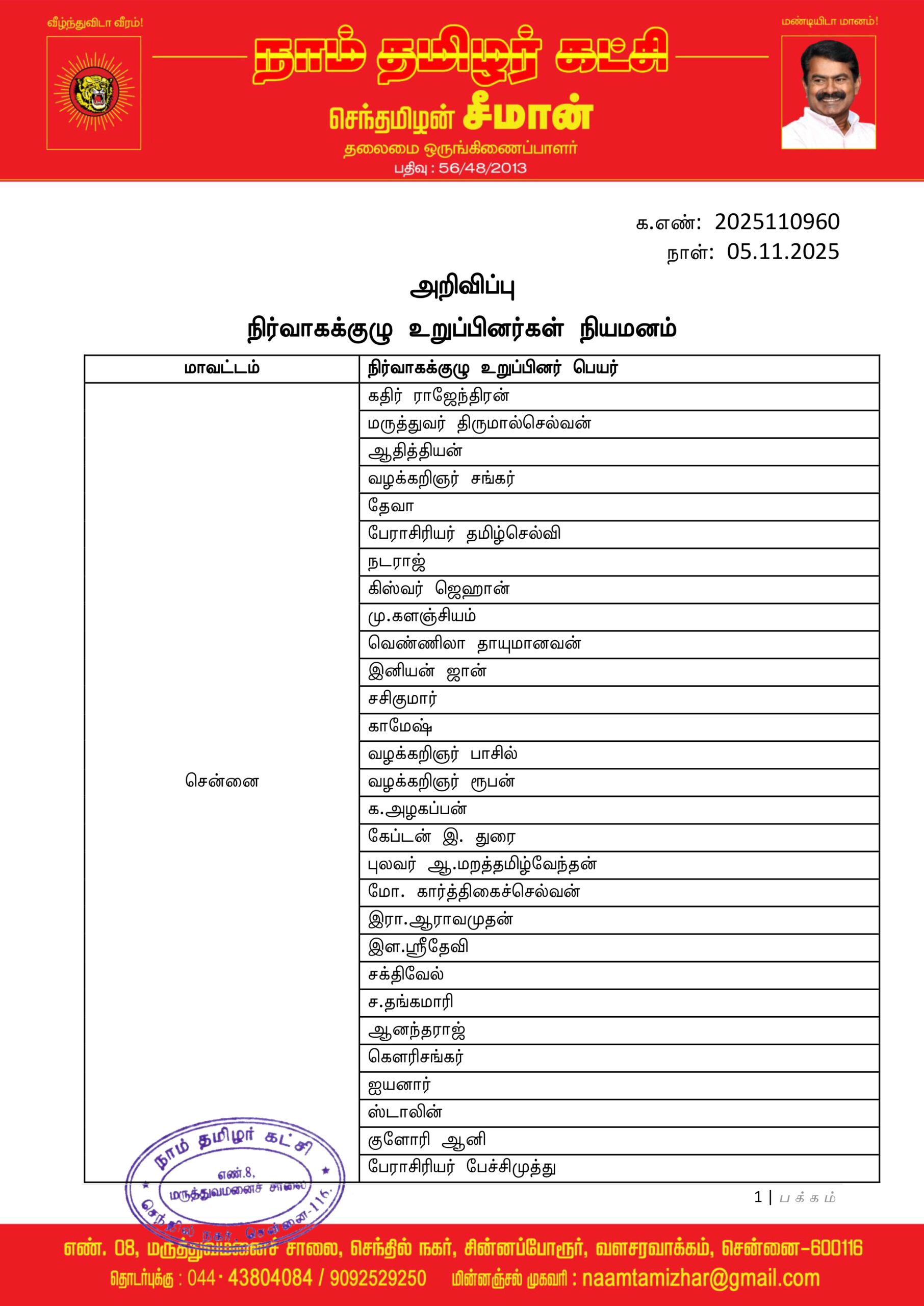 மேற்காண் அனைவரும் நாம் தமிழர் கட்சியின் நிர்வாகக்குழு உறுப்பினர்களாக நியமிக்கப்படுகிறார்கள். இவர்கள் அனைவருக்கும், கட்சியின் அனைத்துநிலைப் பொறுப்பாளர்களும், அன்பு உறவுகள் அனைவரும் முழு ஒத்துழைப்பு நல்குமாறு அன்போடு கேட்டுக் கொள்ளப்படுகிறார்கள்.