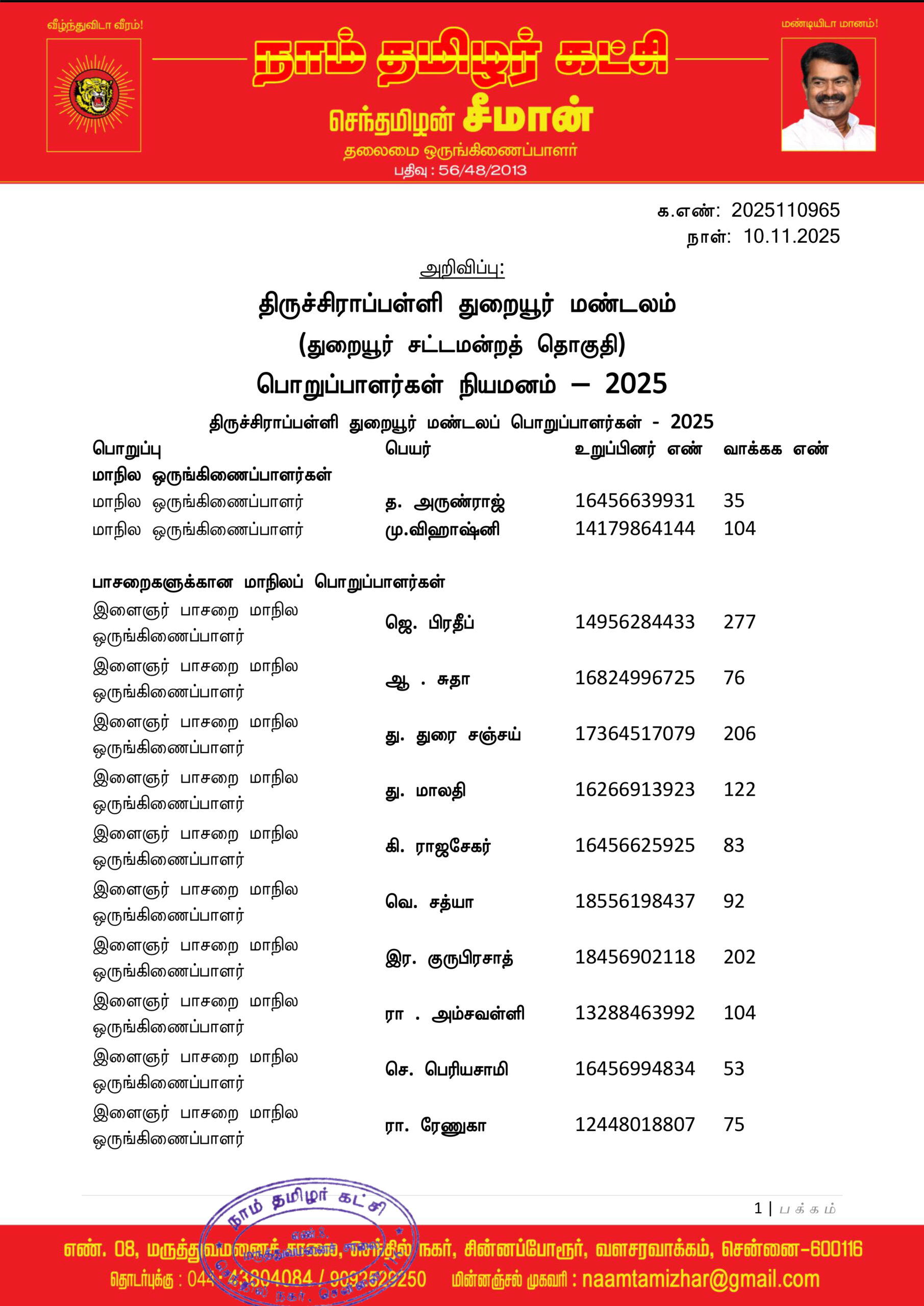 மேற்காண் அனைவரும் நாம் தமிழர் கட்சி – திருச்சிராப்பள்ளி துறையூர் மண்டலத்திற்குட்பட்ட பொறுப்பாளர்களாக நியமிக்கப்படுகிறார்கள். இவர்கள் அனைவருக்கும், கட்சியின் அனைத்துநிலைப் பொறுப்பாளர்களும், அன்பு உறவுகள் அனைவரும் முழு ஒத்துழைப்பு நல்குமாறு அன்போடு கேட்டுக் கொள்ளப்படுகிறார்கள்.