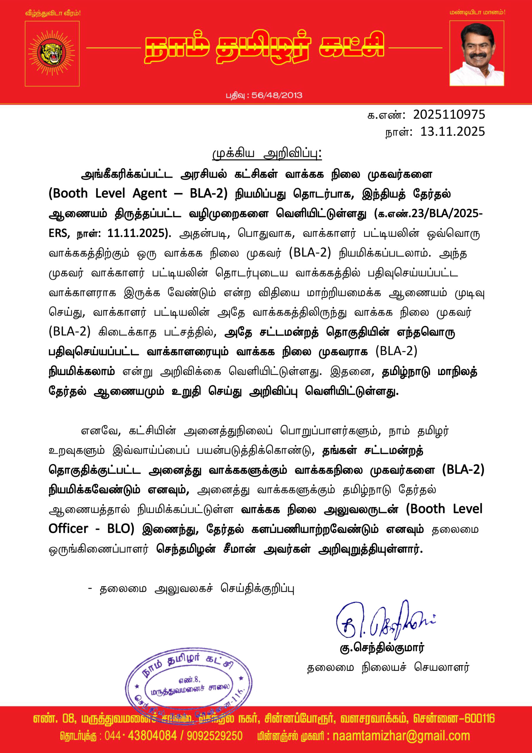 எனவே, கட்சியின் அனைத்துநிலைப் பொறுப்பாளர்களும், நாம் தமிழர் உறவுகளும் இவ்வாய்ப்பைப் பயன்படுத்திக்கொண்டு, தங்கள் சட்டமன்றத் தொகுதிக்குட்பட்ட அனைத்து வாக்ககளுக்கும் வாக்ககநிலை முகவர்களை (BLA-2) நியமிக்கவேண்டும் எனவும், அனைத்து வாக்ககளுக்கும் தமிழ்நாடு தேர்தல் ஆணையத்தால் நியமிக்கப்பட்டுள்ள வாக்கக நிலை அலுவலருடன் (Booth Level Officer – BLO) இணைந்து, தேர்தல் களப்பணியாற்றவேண்டும் எனவும் தலைமை ஒருங்கிணைப்பாளர் செந்தமிழன் சீமான் அவர்கள் அறிவுறுத்தியுள்ளார்.