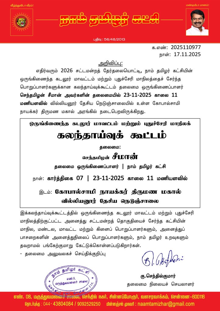 எதிர்வரும் 2026 சட்டமன்றத் தேர்தலையொட்டி, நாம் தமிழர் கட்சியின் ஒருங்கிணைந்த கடலூர் மாவட்டம் மற்றும் புதுச்சேரி மாநிலத்தைச் சேர்ந்த பொறுப்பாளர்களுக்கான கலந்தாய்வுக்கூட்டம் தலைமை ஒருங்கிணைப்பாளர் செந்தமிழன் சீமான் அவர்களின் தலைமையில் 23-11-2025 காலை 11 மணியளவில் வில்லியனூர் தேசிய நெடுஞ்சாலையில் உள்ள கோபால்சாமி நாயக்கர் திருமண மகால் அரங்கில் நடைபெறவிருக்கிறது.