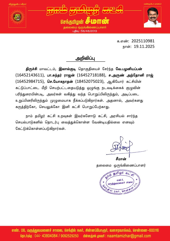 திருச்சி மாவட்டம், இலால்குடி தொகுதியைச் சேர்ந்த வே.பழனியப்பன் (16452143611), பா.சுந்தர் ராஜன் (16452718188), ச.அருண் அந்தோனி ராஜ் (16452984715), செ.யோகநாதன் (18452075023), ஆகியோர் கட்சியின் கட்டுப்பாட்டை மீறி செயற்பட்டதையடுத்து ஒழுங்கு நடவடிக்கைக் குழுவின் பரிந்துரையின்படி, அவர்கள் வகித்து வந்த பொறுப்பிலிருந்தும், அடிப்படை உறுப்பினரிலிருந்தும் முழுமையாக நீக்கப்படுகிறார்கள். அதனால், அவர்களது கருத்திற்கோ, செயலுக்கோ இனி கட்சி பொறுப்பேற்காது.