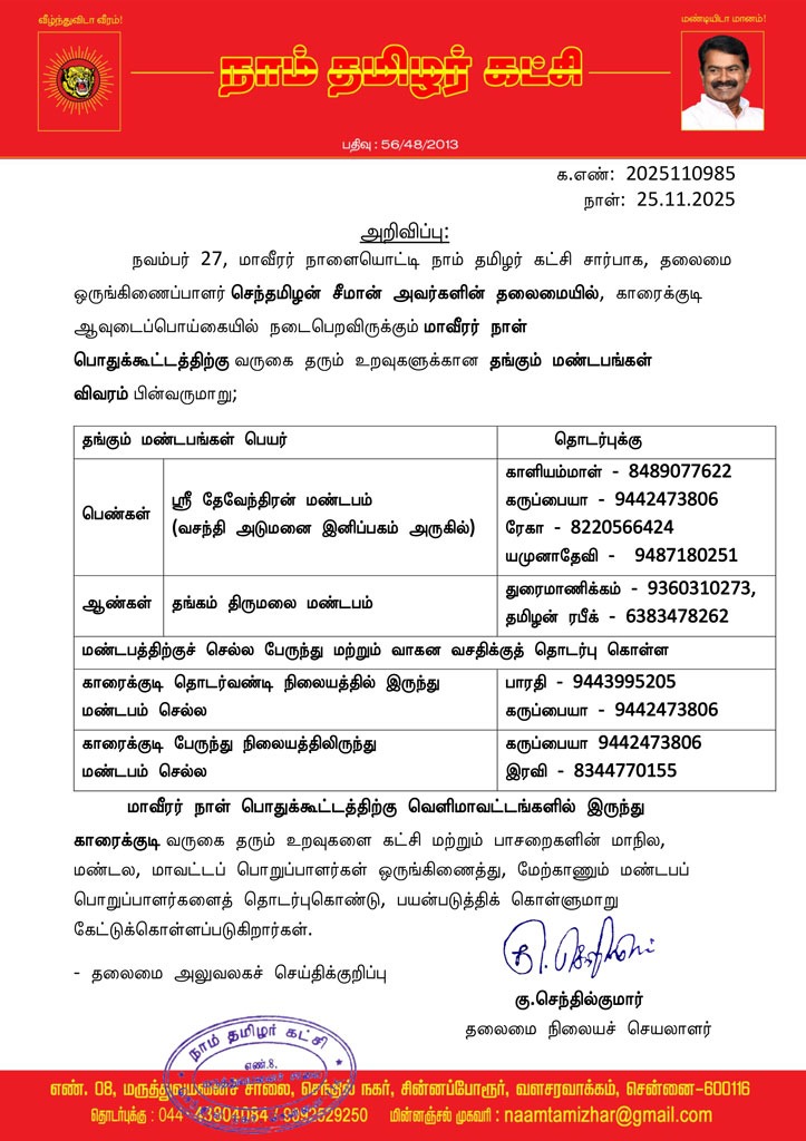 மாவீரர் நாள் பொதுக்கூட்டத்திற்கு வெளிமாவட்டங்களில் இருந்து காரைக்குடி வருகை தரும் உறவுகளை கட்சி மற்றும் பாசறைகளின் மாநில, மண்டல, மாவட்டப் பொறுப்பாளர்கள் ஒருங்கிணைத்து, மேற்காணும் மண்டபப் பொறுப்பாளர்களைத் தொடர்புகொண்டு, பயன்படுத்திக் கொள்ளுமாறு