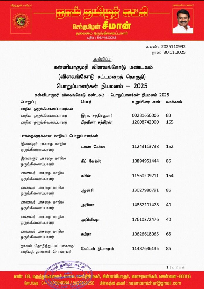தலைமைச் செய்திகள்இளைஞர் பாசறைமகளிர் பாசறைஅறிவிப்புகள்வீரத்தமிழர் முன்னணிபொறுப்பாளர்கள் நியமனம்விளவங்கோடுமருத்துவப் பாசறைசுற்றுச்சூழல் பாசறைதகவல் தொழில்நுட்பப் பாசறை.மாணவர் பாசறைகன்னியாகுமரி மாவட்டம் தலைமை அறிவிப்பு – கன்னியாகுமரி விளவங்கோடு மண்டலம் (விளவங்கோடு சட்டமன்றத் தொகுதி) – பொறுப்பாளர்கள் நியமனம் 2025 டிசம்பர் 10, 2025 5 க.எண்: 2025110992 நாள்: 30.11.2025