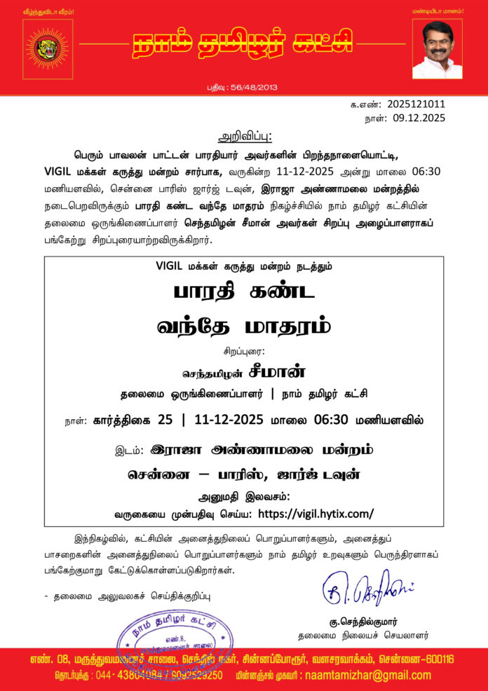 VIGIL மக்கள் கருத்து மன்றம் சார்பாக, வருகின்ற 11-12-2025 அன்று மாலை 06:30 மணியளவில், சென்னை பாரிஸ் ஜார்ஜ் டவுன், இராஜா அண்ணாமலை மன்றத்தில் நடைபெறவிருக்கும் பாரதி கண்ட வந்தே மாதரம் நிகழ்ச்சியில் நாம் தமிழர் கட்சியின் தலைமை ஒருங்கிணைப்பாளர் செந்தமிழன் சீமான் அவர்கள் சிறப்பு அழைப்பாளராகப் பங்கேற்று சிறப்புரையாற்றவிருக்கிறார்.