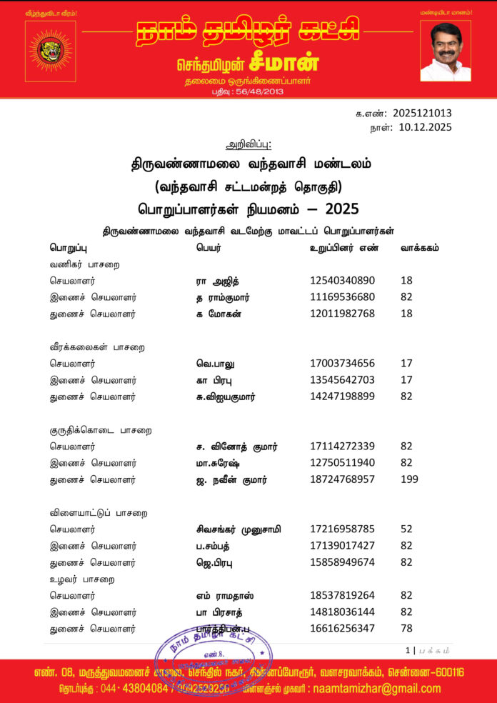 மேற்காண் அனைவரும் நாம் தமிழர் கட்சி – திருவண்ணாமலை வந்தவாசி மண்டலத்திற்குட்பட்ட பொறுப்பாளர்களாக நியமிக்கப்படுகிறார்கள். இவர்கள் அனைவருக்கும், கட்சியின் அனைத்துநிலைப் பொறுப்பாளர்களும், அன்பு உறவுகள் அனைவரும் முழு ஒத்துழைப்பு நல்குமாறு அன்போடு கேட்டுக் கொள்ளப்படுகிறார்கள்.