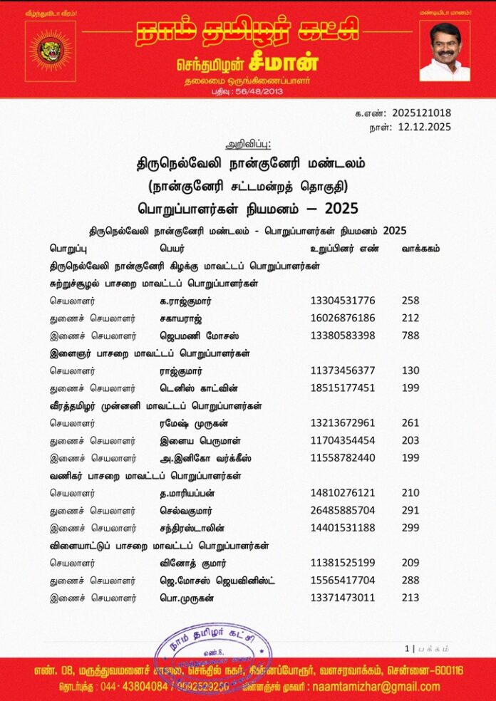 தலைமை அறிவிப்பு – திருநெல்வேலி நான்குனேரி மண்டலம் (நான்குனேரி சட்டமன்றத் தொகுதி) பொறுப்பாளர்கள் நியமனம்