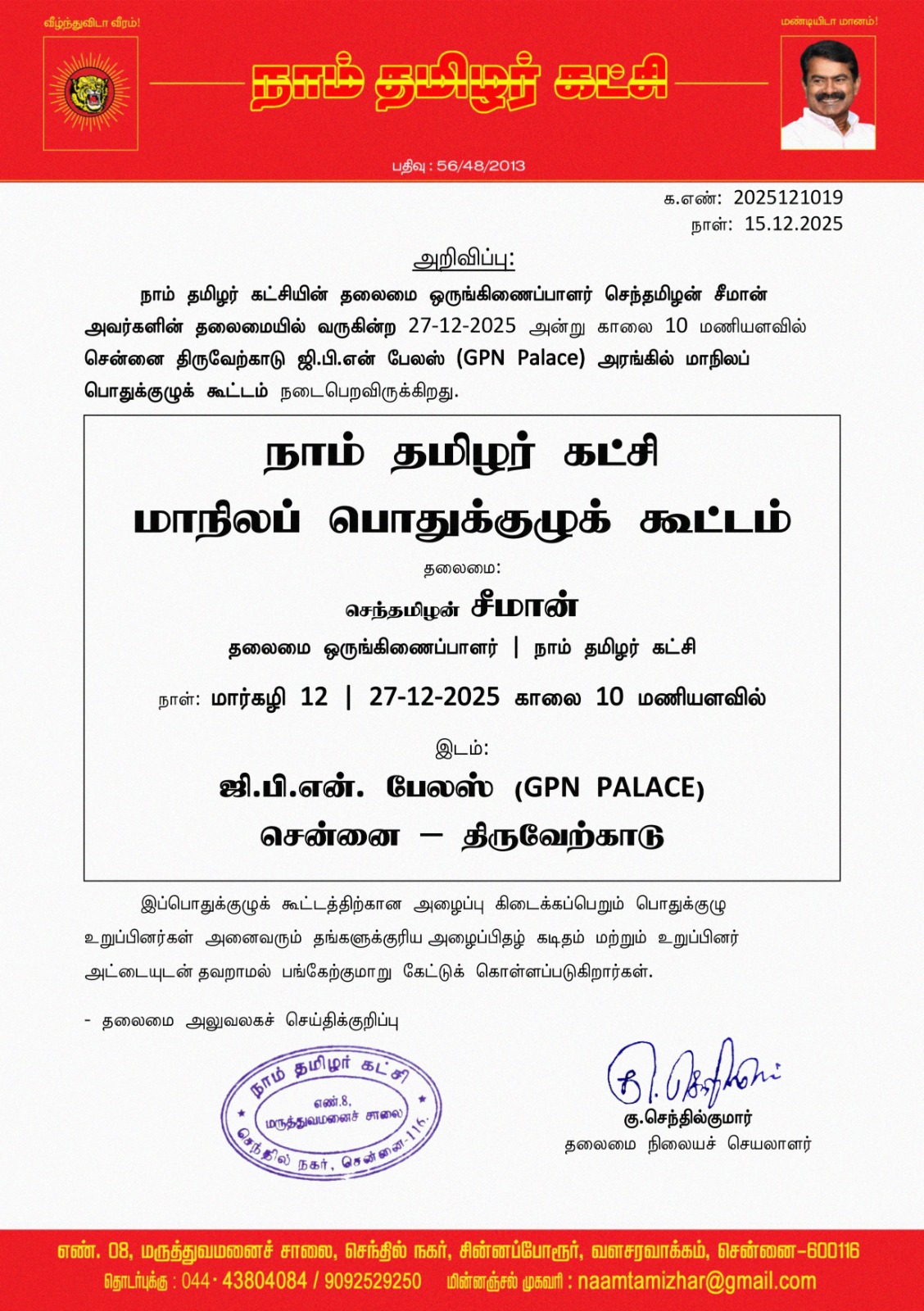 நாம் தமிழர் கட்சியின் தலைமை ஒருங்கிணைப்பாளர் செந்தமிழன் சீமான் அவர்களின் தலைமையில் வருகின்ற 27-12-2025 அன்று காலை 10 மணியளவில் சென்னை திருவேற்காடு ஜி.பி.என் பேலஸ் (GPN Palace) அரங்கில் மாநிலப் பொதுக்குழுக் கூட்டம் நடைபெறவிருக்கிறது.