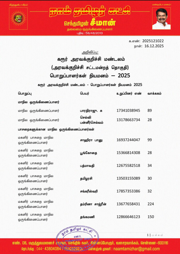 மேற்காண் அனைவரும் நாம் தமிழர் கட்சி – கரூர் அரவக்குறிச்சி மண்டலத்திற்குட்பட்ட பொறுப்பாளர்களாக நியமிக்கப்படுகிறார்கள். இவர்கள் அனைவருக்கும், கட்சியின் அனைத்துநிலைப் பொறுப்பாளர்களும், அன்பு உறவுகள் அனைவரும் முழு ஒத்துழைப்பு நல்குமாறு அன்போடு கேட்டுக் கொள்ளப்படுகிறார்கள். புதிதாகப் பொறுப்பேற்கும் உறவுகள் அனைவருக்கும் என்னுடைய புரட்சி வாழ்த்துகள். பொறுப்பையும் கடமையையும் உணர்ந்து நீங்கள் சிறப்பாகச் செயலாற்றுவீர்கள் என்ற நம்பிக்கையோடு,