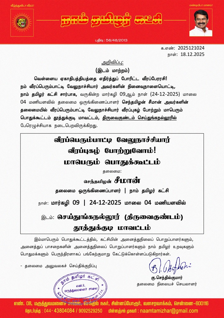 நம் வீரப்பெரும்பாட்டி வேலுநாச்சியார் அவர்களின் நினைவுநாளையொட்டி, நாம் தமிழர் கட்சி சார்பாக, வருகின்ற மார்கழி 09ஆம் நாள் (24-12-2025) மாலை 04 மணியளவில் தலைமை ஒருங்கிணைப்பாளர் செந்தமிழன் சீமான் அவர்களின் தலைமையில் வீரப்பெரும்பாட்டி வேலுநாச்சியார் வீரப்புகழ் போற்றும் மாபெரும் பொதுக்கூட்டம் தூத்துக்குடி மாவட்டம், திருவைகுண்டம் செய்துங்கநல்லூரில் பேரெழுச்சியாக நடைபெறவிருக்கிறது.