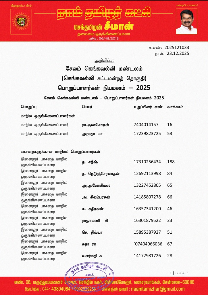 சேலம் கெங்கவல்லி மண்டலம் – பொறுப்பாளர்கள் நியமனம் 2025