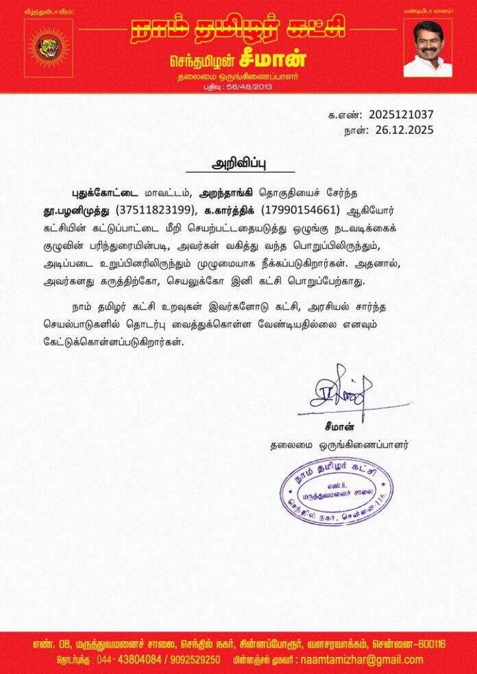 புதுக்கோட்டை மாவட்டம், அறந்தாங்கி தொகுதியைச் சேர்ந்த தூ.பழனிமுத்து (37511823199), க.கார்த்திக் (17990154661) ஆகியோர் கட்சியின் கட்டுப்பாட்டை மீறி செயற்பட்டதையடுத்து ஒழுங்கு நடவடிக்கைக் குழுவின் பரிந்துரையின்படி, அவர்கள் வகித்து வந்த பொறுப்பிலிருந்தும், அடிப்படை உறுப்பினரிலிருந்தும் முழுமையாக நீக்கப்படுகிறார்கள். அதனால், அவர்களது கருத்திற்கோ, செயலுக்கோ இனி கட்சி பொறுப்பேற்காது.